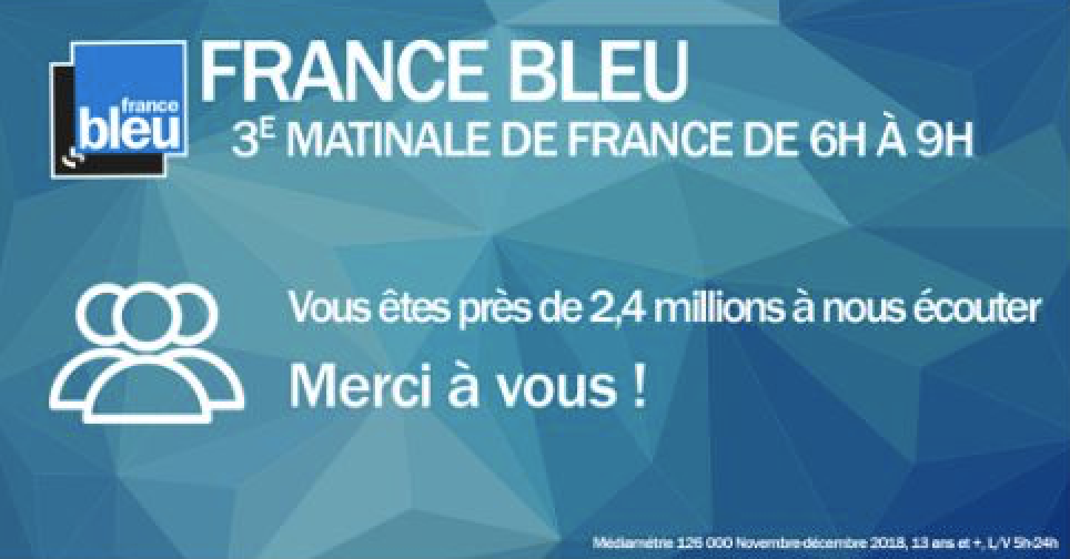 Dans le cadre de la dernière 126 000 Radio de Médiamétrie, le réseau France Bleu, avec ses 44 stations, se positionne comme la 3e matinale de France de 6h à 9h, sur le critère de la part d'audience. Le réseau local de Radio France est écouté quotidiennement par de 2 414 000 auditeurs. À 8h, France Bleu attire 1 169 000 million auditeurs ( soit un gain de 18 000 auditeurs sur un an). France Bleu a aussi gagné 125 000 auditeurs de moins de 50 ans. Enfin, sur le digital, le réseau a généré 24.8 millions de visites, soit une hausse de 144 % (versus novembre 2017).