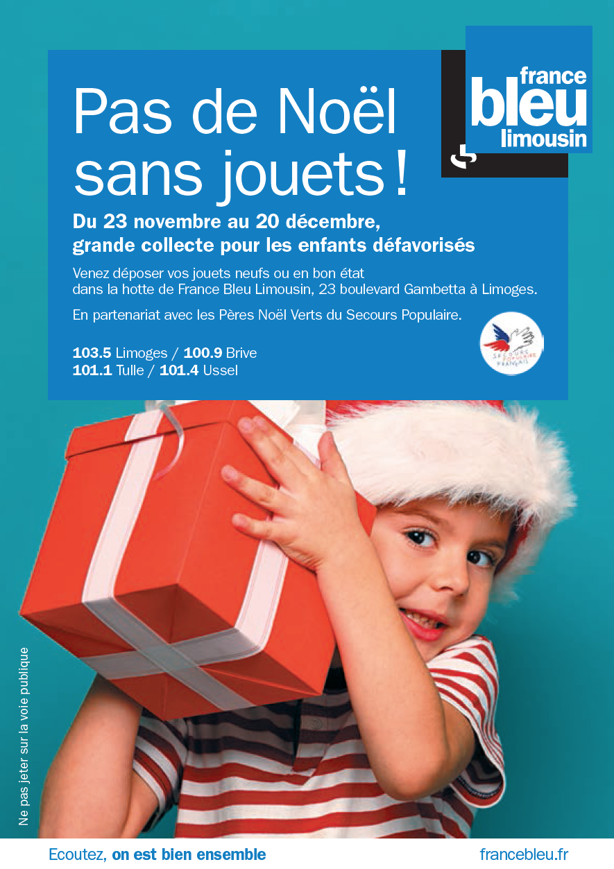 "Pas de Noël sans jouet". Du 23 novembre au 20 décembre, France Bleu Limousin organise une grande collecte pour les enfants défavorisés. Les auditeurs de la Haute-Vienne et de la Corrèze sont invités à déposer des jouets neufs ou en bon état dans une hotte située dans les locaux de la radio, au 23 boulevard Gambetta à Limoges.