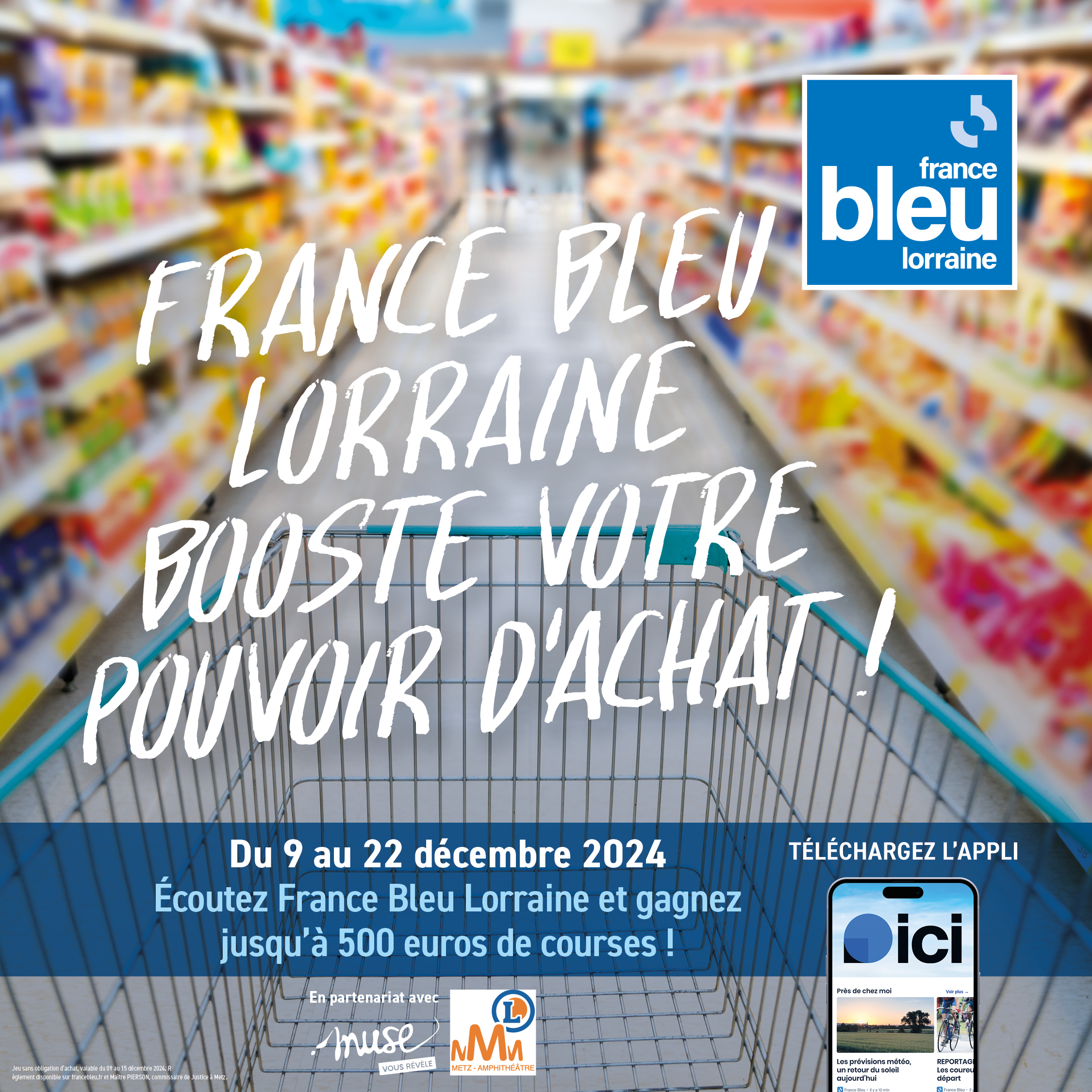 À Metz, pour écouter France Bleu, les lorrains se branchent sur le 98.5. Et si justement, ils n’avaient que 98.5 secondes pour faire leurs courses et passer en caisse sans rien débourser ? C’est le défi un peu fou que lance la première radio de proximité en Moselle à ses auditeurs. Du 9 au 22 décembre, France Bleu Lorraine les invitent à s’inscrire sur francebleu.fr et l’application "Ici". À l’issue d’un tirage, qui se déroulera les dimanches 15 et 22 décembre dans 3Ici Matin weekend", deux heureux lorrains auront la chance de participer à cette course infernale.