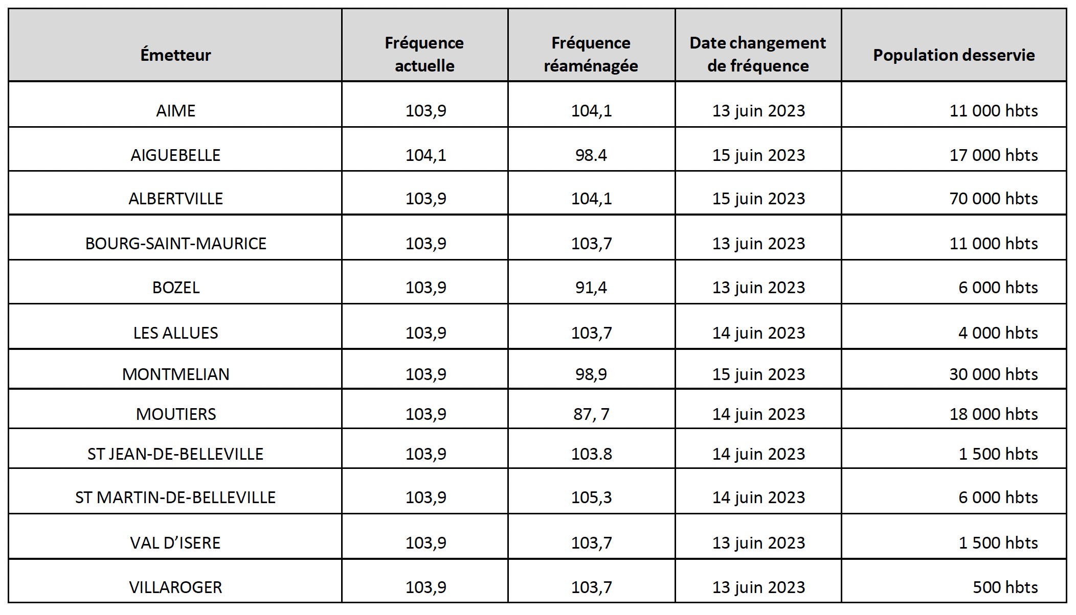 Si les conditions météorologiques le permettent, les émetteurs situés dans la vallée de Val d’Isère et une partie de ceux des 3 vallées, verront leur fréquence modifiée, ce mardi. Ce mercredi 14 juin, les émetteurs de la vallée de Belleville jusqu’à Moutiers changeront de fréquence. Enfin, ce jeudi 15 juin, les émetteurs de Montmélian à Albertville seront à leur tour concernés par le changement de fréquence.