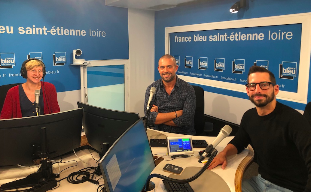 Le studio de France Bleu Saint-Étienne Loire avec (de gauche à droite) : Tifany Antkowiak (journaliste), Grégory Régnier (animateur) et Sébastien Cabrita Dos Santos (journaliste)