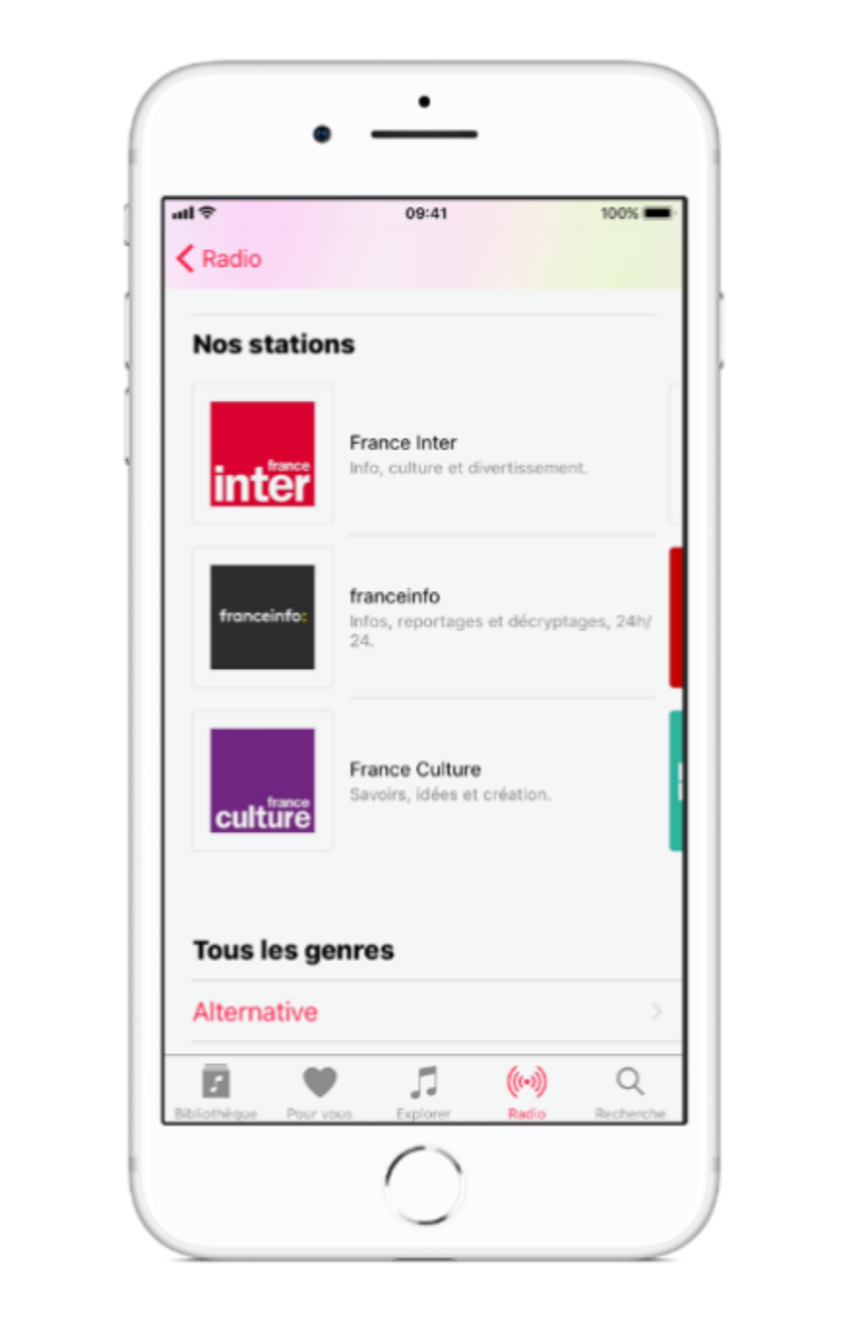 Trois chaînes de Radio France font ainsi leur entrée sur Apple Music : France Inter (avec ses 6 millions d’auditeurs par jour et ses 34 millions d’émissions téléchargées, franceinfo (qui relate et analyse l'actualité avec 160 journalistes et ses 61 millions de vidéos vues sur l'ensemble des plateformes partenaires) et France Culture (qui se positionne désormais comme un "média global de la création, des idées et des savoirs" avec 21.8 millions de podcasts et 8 millions de visites tous supports).