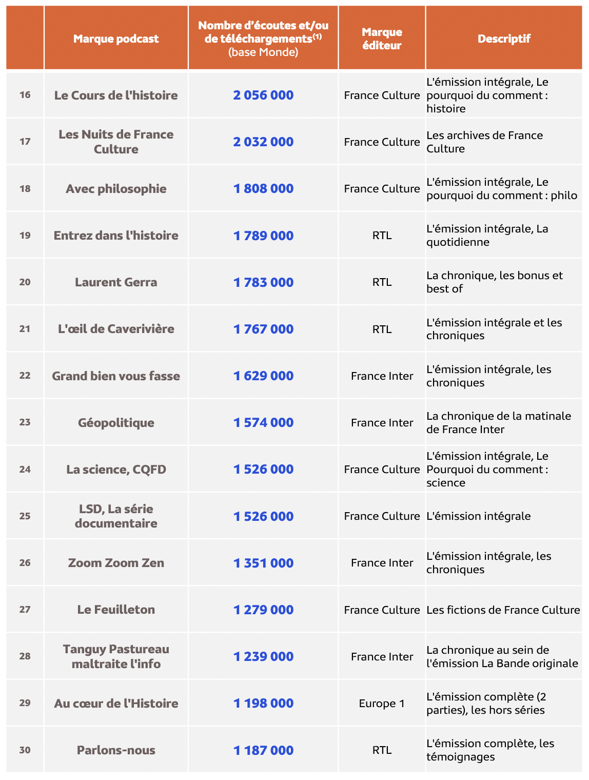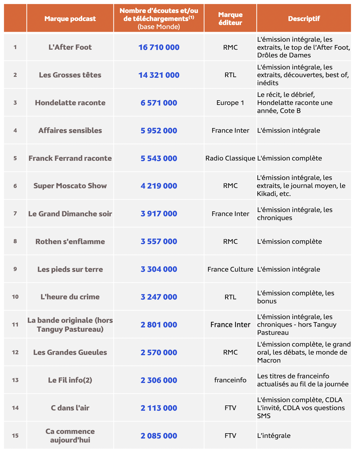 L'émission "L'After Foot" sur RMC est l'émission la plus écoutée et/ou téléchargée : : 16 710 000. Elle laisse derrière, à plus de deux millions, "Les Grosses têtes" sur RTL : 14 321 000. Suivent "Hondelatte raconte" (Europe 1), "Affaires sensibles" (France Inter) et "Franck Ferrand raconte" (Radio Classique).