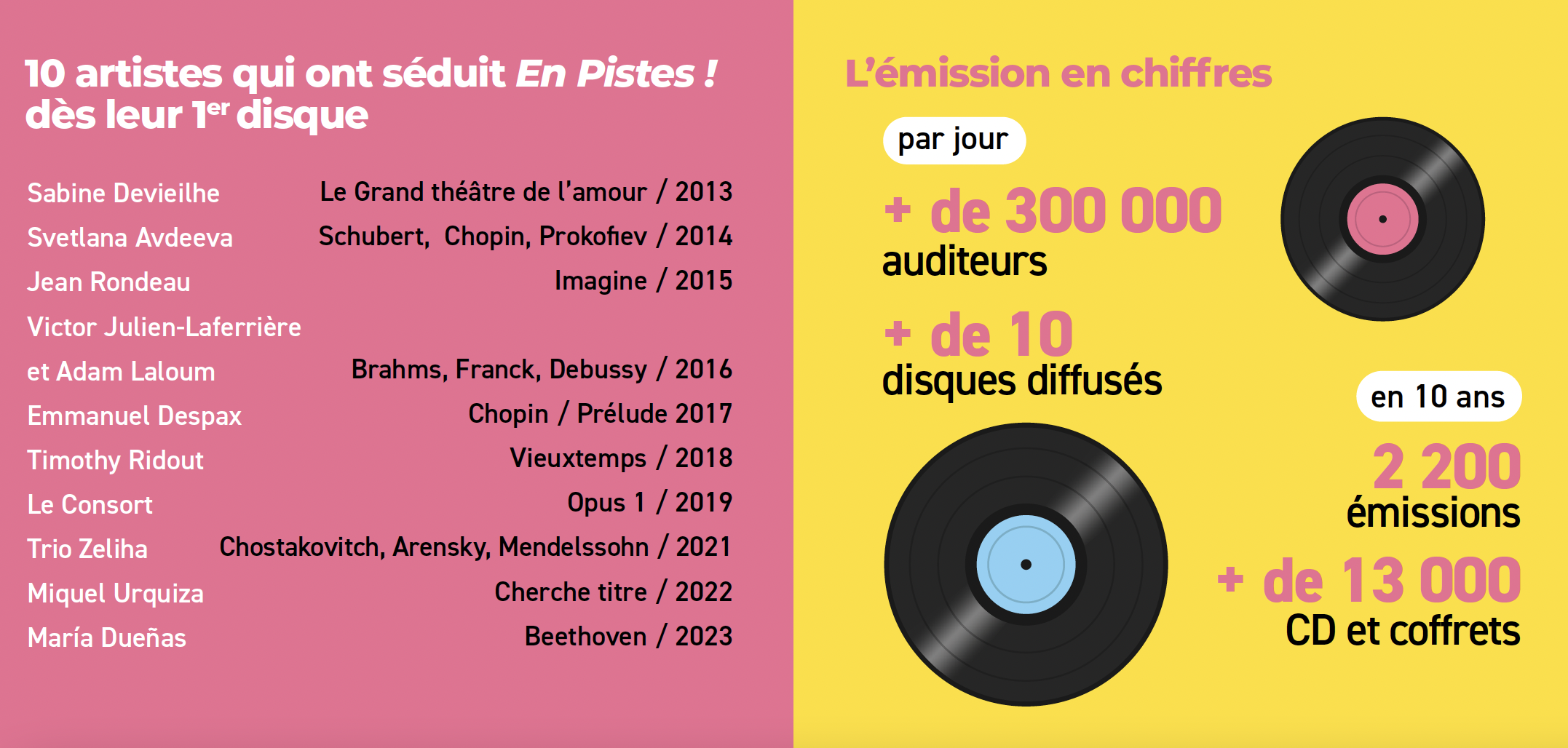 "Depuis maintenant 10 ans, nous avons la chance de diffuser sur France Musique une grande partie des nouveautés discographiques. Cela nous a donné l’occasion de découvrir de jeunes artistes, de suivre l’évolution de musiciens accomplis et de parcourir le monde à l’écoute de différents ensembles internationaux. Cela nous a surtout permis de constater que l’industrie du disque est toujours aussi vivante, malgré une mort annoncée il y a déjà de longues années. Il nous semblait donc important de célébrer ses 10 saisons d’actualité discographique, mais aussi les 10 ans d’amitié, de complicité et de fou-rires de notre duo qui (selon nous) n’a pas pris une ride ! Nous avons voulu fêter cette décennie sur scène avec des artistes dont les enregistrements nous ont marqués et accompagné" ont indiqué Émilie Munera et Rodolphe Bruneau-Boulmier.