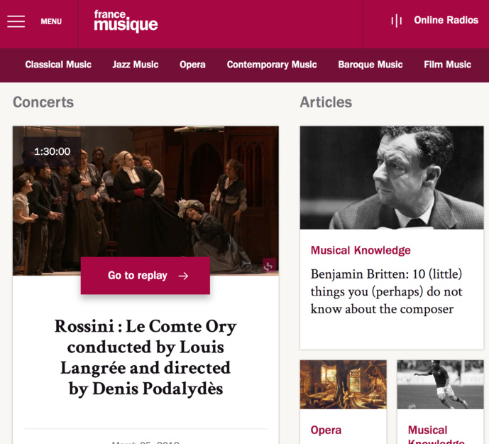 Ils y retrouveront des articles de France Musique, découvrir ou redécouvrir des vidéos de sessions studios enregistrées lors d’émissions à la Maison de la Radio ou ailleurs, visionner et écouter des concerts (plus de 1600), en particulier ceux donnés par les formations dites maison : Orchestre philharmonique de Radio France, Orchestre National de France, Chœur et Maîtrise de Radio France. Si pour les non-francophones écouter France Musique n’est pas toujours évident car la radio n’est pas seulement musicale, il leur sera plus facile d’écouter les 7 webradios lancées par la chaîne en 2016.