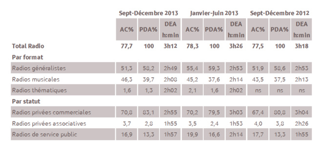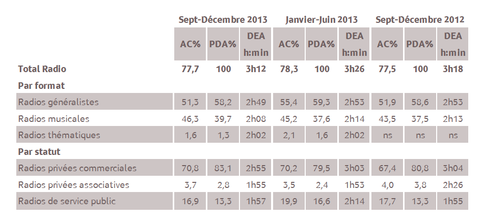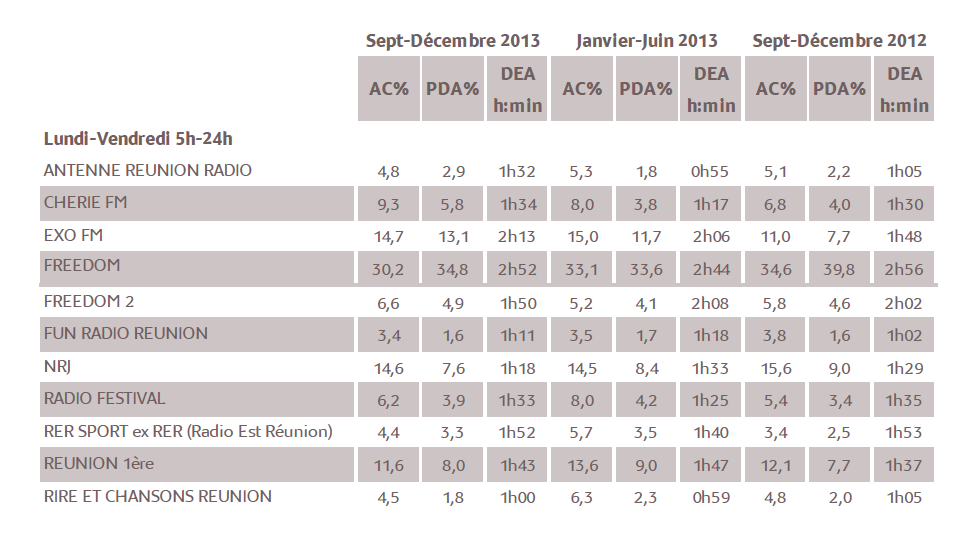 Seuls sont mentionnés dans le tableau ci-dessus les résultats des stations qui ont souscrit à l’étude au jour de parution, et dont l’audience cumulée pour un jour moyen de semaine Lundi – Vendredi (5h-24h) atteint 2%