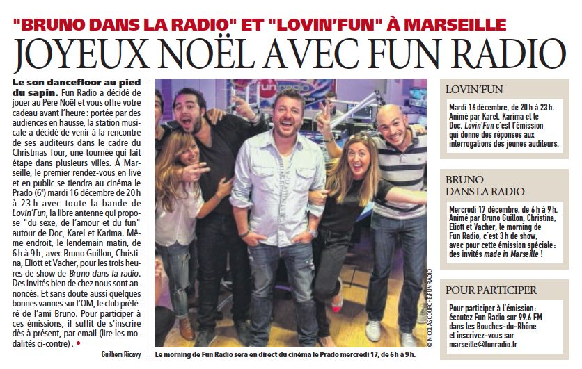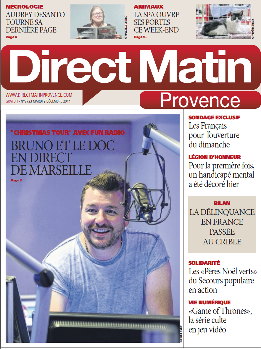 Ce matin, Bruno Guillon, l'animateur de "Bruno Dans La Radio" fait la une de l'édition provençale de Direct Matin. Le quotidien évoque la venue à Marseille de l'équipe de Fun Radio, les 16 et 17 décembre prochains, dans le cadre son Christmas Tour.