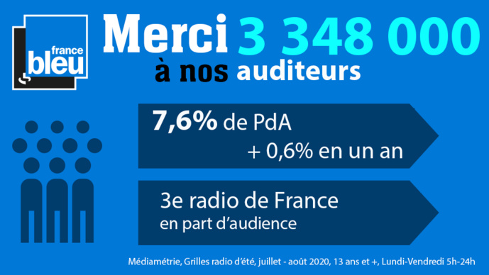 France Inter confirme sa place de première radio de France et de première matinale de France avec 10.2 % d’audience cumulée, soit 5 538 000 auditeurs Sur le numérique, la station enregistre 34 millions d’écoutes à la demande en moyenne par mois. franceinfo affiche une audience record et en très forte progression la hissant 3e radio de France cet été avec 552 000 auditeurs. France Bleu progresse en PDA et séduit 3.35 millions d’auditeurs chaque jour et 6.2 % d’audience cumulée, soit 3 348 000 auditeurs France Culture est toujours solide avec 2.3 % d’audience cumulée, soit 1 242 000 auditeurs et 2.1 % de part d’audience.