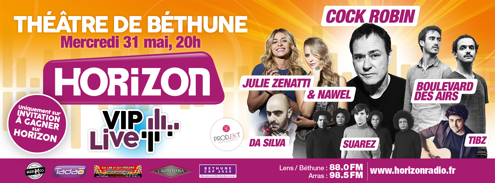 Ils ne seront que 900 à pouvoir approcher les artistes du "Horizon VIP Live" qui se déroulera le mercredi 31 mai prochain au Théâtre de Béthune. Dès 20h, de nombreux interprètes vont se succéder : Cock Robin, Boulevard des Airs, Julie Zenatti et Nawel, Tibz, Da Silva et Suarez. Le tout orchestré par Cyril Jamet, animateur de la matinale sur Horizon. Aucune place ne se trouve disponible à la vente. Toutes sont gratuites et uniquement sur invitation. Pour se procurer ces fameux sésames, une seule solution : écouter Horizon et tenter sa chance aux différents jeux proposés depuis ce lundi. En moins de 18 mois, Horizon a déjà organisé 7 concerts. En tout, près de 32 000 personnes ont assisté à ces shows à Béthune, Harnes et Lens.