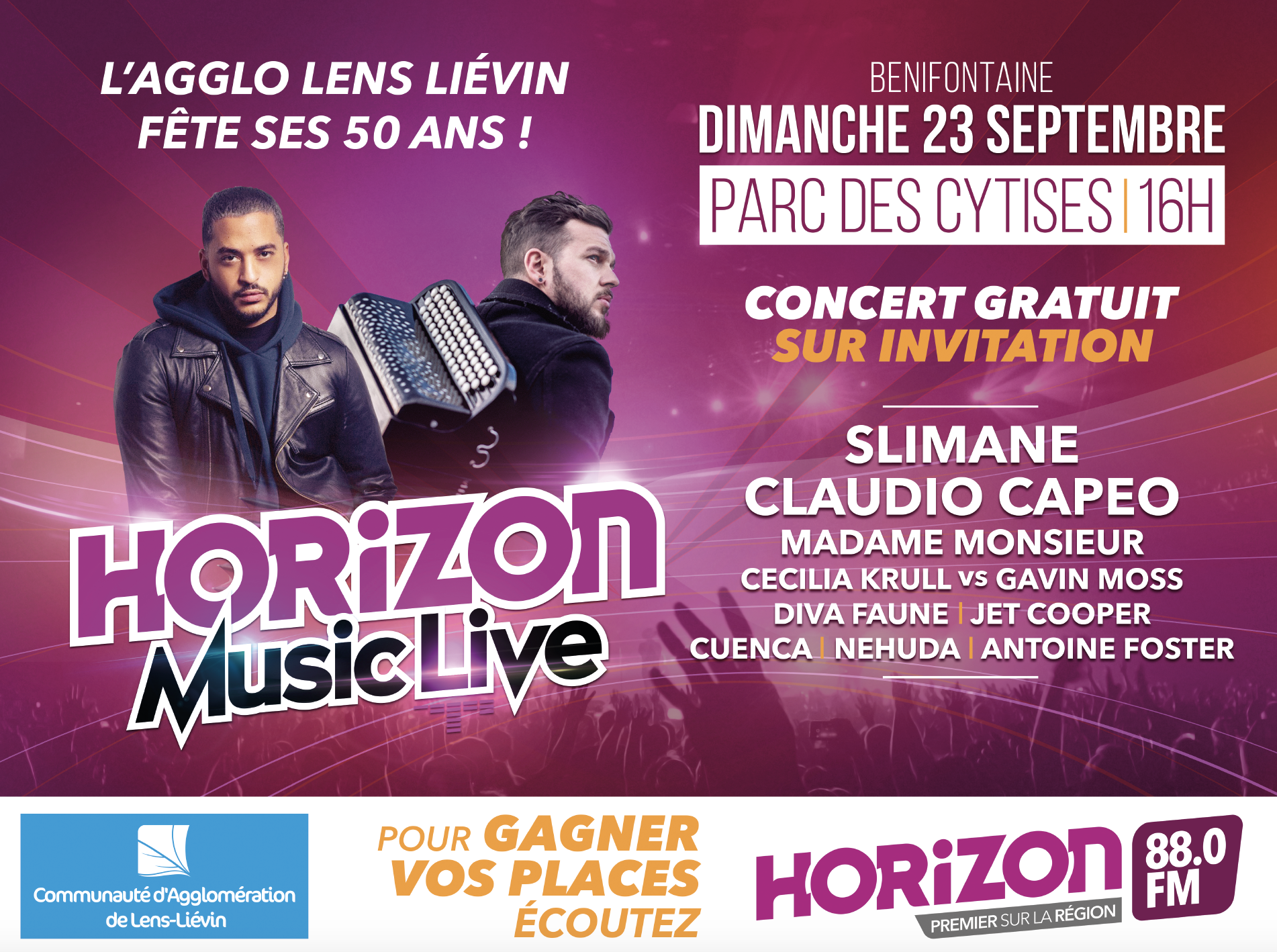 Après Bob Sinclar, Christophe Willem, Amir, Synapson, Kyo… venus enflammer le stade couvert de Liévin en mai, Martin Solveig qui a fait danser Béthune le 14 juillet, Vitaa qui a fait chanter Arras le 15 août, les auditeurs de Horizon ont rendez-vous dimanche 23 septembre à 16h au Parc des Cytises à Bénifontaine avec Slimane, Claudio Capéo, Madame Monsieur, Diva Faune mais également Jet Cooper, Cuenca, Nehuda, Nawel Ben Kraeim et Antoine Foster.
