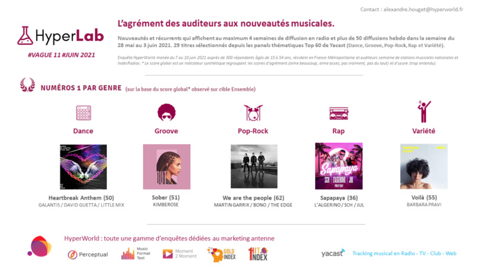 Voici les nouveautés et les récurrents qui affichent au maximum 4 semaines de diffusion en radio et plus de 50 diffusions hebdo dans la semaine du 28 mai au 3 juin 2021. 29 titres sélectionnés depuis les panels thématiques Top 60 de Yacast (Dance, Groove, Pop-Rock, Rap et Variété). Une enquête HyperWorld menée du 7 au 10 juin 2021 auprès de 300 répondants âgés de 15 à 54 ans, résidant en France Métropolitaine et auditeurs semaine de stations musicales nationales et Indés Radios.Dans la même rubrique :