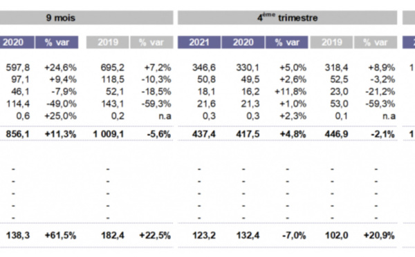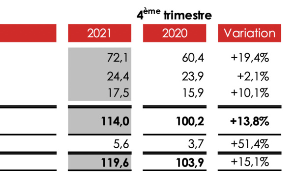 NRJ Group enregistre au 4e trimestre 2021 un chiffre d’affaires consolidé hors échanges de 114.0 M€ en forte croissance de 13.8% par rapport au 4e trimestre 2020 et de 6.3% par rapport à la même période de 2019. Le chiffre d’affaires consolidé hors échanges de l’exercice 2021 s’établit à 365.1 M€ en hausse de 12.4% par rapport à celui de l’exercice 2020.