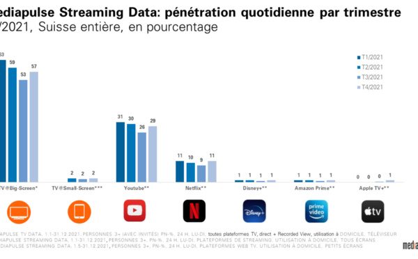 Le quatrième rapport trimestriel sur les Mediapulse Streaming Data indique pour la première fois l’audience des offres par appareil : la télévision et Netflix atteignent principalement leur public sur le téléviseur, tandis que YouTube est surtout consommé sur des appareils à petit écran.