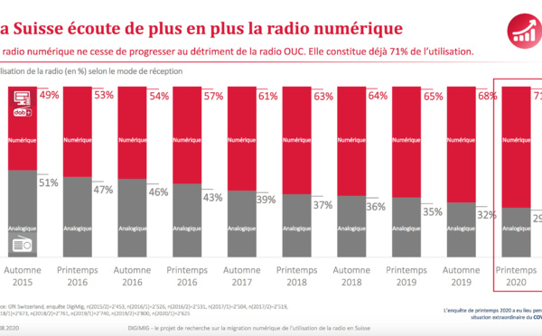 La radio numérique ne cesse de progresser au détriment de la radio FM. Elle constitue déjà 71% de l’utilisation. La FM continue à perdre du terrain face au DAB+ et à la radio IP. 39 minutes de radio sur 100 sont écoutées sur DAB+. Et l'utilisation du DAB+ augmente plus rapidement que celle de la radio IP, laquelle a néanmoins dorénavant dépassé la FM...