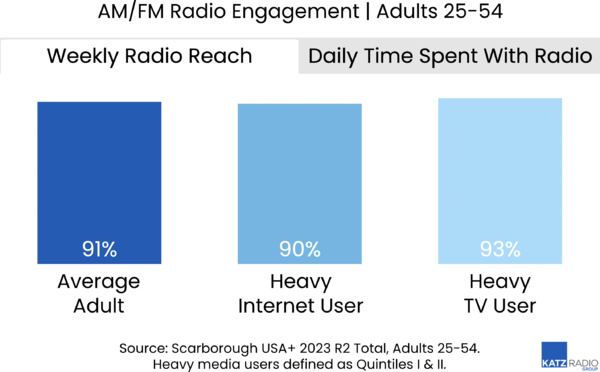 La dernière analyse de Katz sur les données nationales de Nielsen Scarborough explore l'engagement radio des adultes de 25 à 54 ans, une cohorte qui comprend les Millennials, la Génération X et même les consommateurs de la Génération Z, pour voir comment la radio s'intègre dans leur vie, à côté de la télévision et de l'Internet.