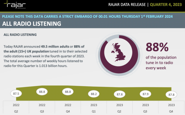 Au Royaume-Uni, l'institut RAJAR (Radio Joint Audience Research) a dévoilé les audiences de la radio pour le quatrième trimestre de l'année 2023. RAJAR a annoncé que 49.5 millions d'adultes, soit 88% de la population adulte (15 ans et plus) du Royaume-Uni, ont écouté chaque semaine les stations de radio sélectionnées au cours du quatrième trimestre 2023.