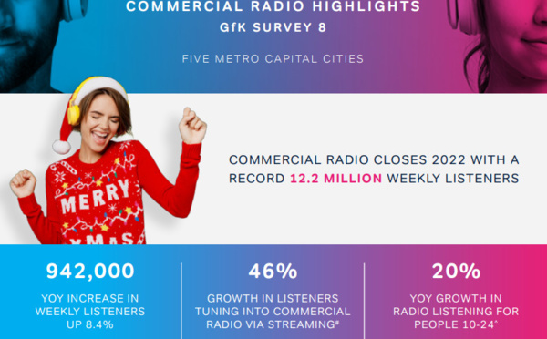 La radio australienne commerciale termine 2022 en réalisant un record. Selon la dernière enquête GfK Survey, 12.2 millions de personnes ont écouté une radio commerciale, chaque semaine. Il s'agit de la neuvième hausse consécutive de la croissance cumulée de l'audience.