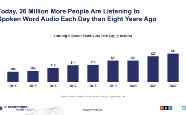 Près de la moitié (46%) de la population américaine écoute quotidiennement du contenu audio parlé, selon le dernier rapport publié par NPR et Edison Research. La quatrième version de ce rapport annuel explore les façons dont la consommation des médias parlés aux États-Unis a augmenté au fil du temps, y compris le nombre d'auditeurs et la durée d'écoute.