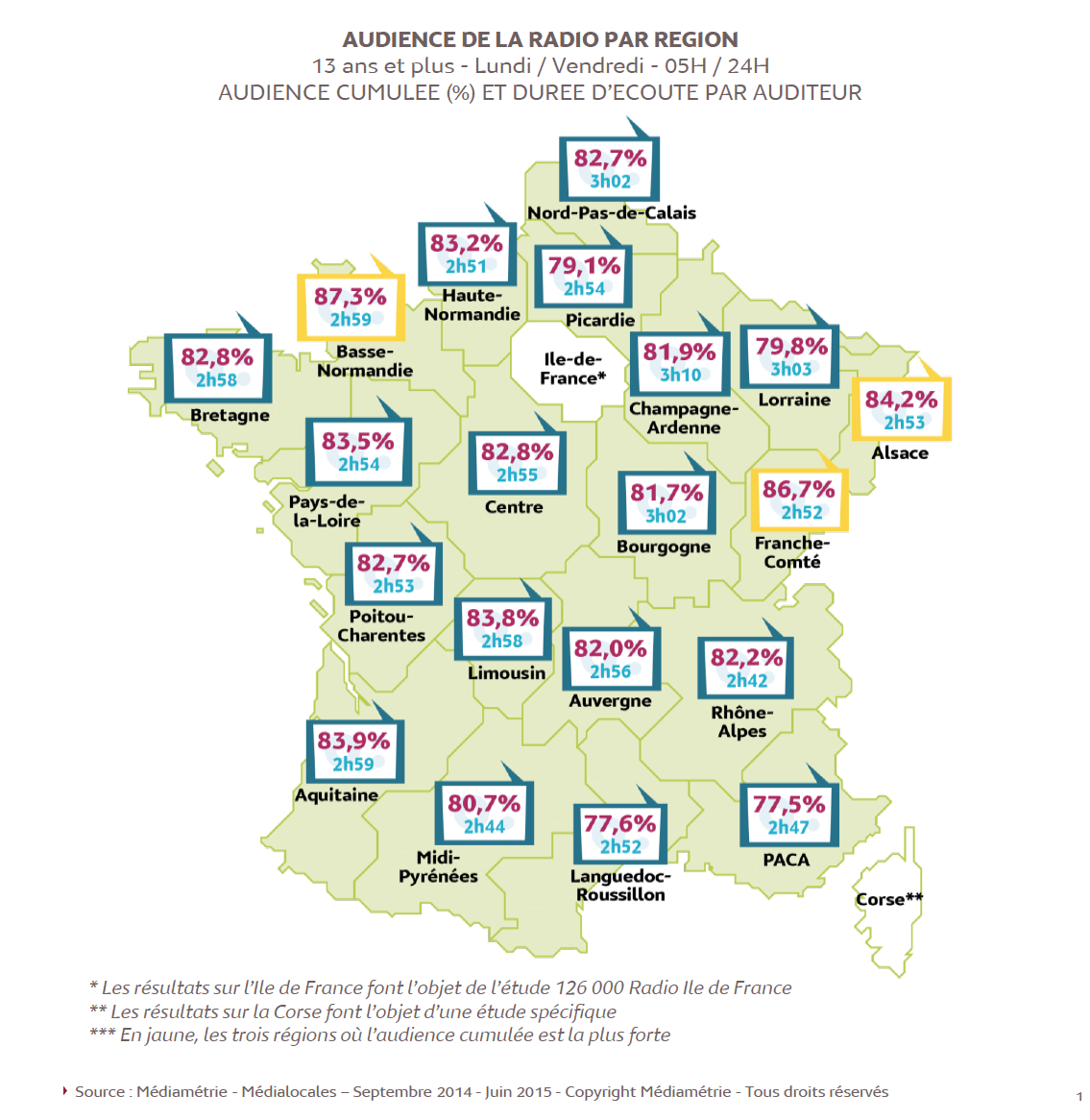 Le média Radio présente en effet des spécificités régionales et locales, tenant compte de l'historique des implantations, de la densité de l'offre et de la structure socio-démographique de la population. Parmi ces 20 régions, la Basse-Normandie arrive en tête avec 87,3% d’audience cumulée, suivie de la Franche-Comté (86,7%) et de l’Alsace (84,2%).