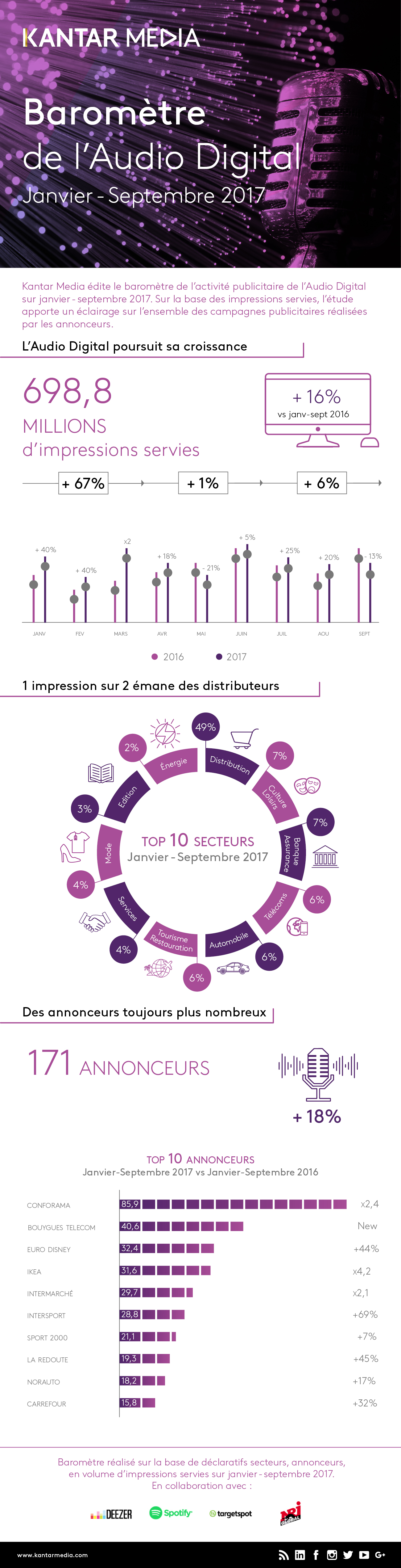 Récemment Kanta Media a publié son baromètre qui mesure l'activité publicitaire de l'audio digital durant la période comprise entre janvier et septembre 2017. L'audio digital poursuit sa croissance avec près de 700 millions d'empressions servies. C'est une hausse de 16% comparativement à la même période en 2016 avec une hausse de 18% du nombre des annonceurs.Brulhatour est le rédacteur en chef du magazine La Lettre Pro de la Radio et le directeur associé... En savoir plus sur cet auteur