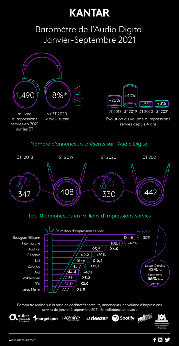 Sur cette période couvrant les 8 premiers mois de l'année 2021, Kantar a comptabilisé 1.490 milliard d'impressions servies durant ces 3 trimestres, soit une hausse de 8% (versus la même période en 2020). Le nombre d'annonceurs présents n'a cessé d'augmenter depuis 2018 : 347, 408, 330 et 442 pour cette période.