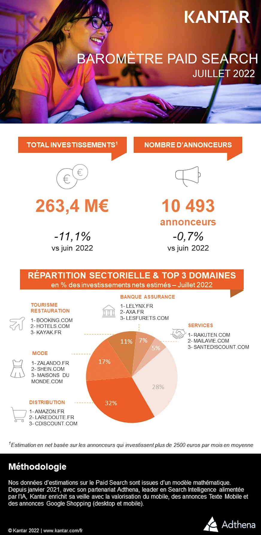 Ce nouveau Baromètre Paid Search mensuel réalisé par Kantar propose un zoom sur le mois de juillet 2022 et revient sur le niveau d’investissements nets par rapport à juin 2022, le nombre d’annonceurs ainsi que la répartition sectorielle et le top 3 domaines pour chaque marché.Brulhatour est le rédacteur en chef du magazine La Lettre Pro de la Radio et le directeur associé... En savoir plus sur cet auteur