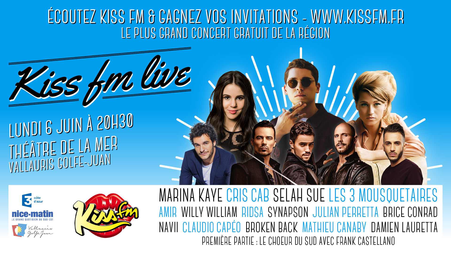 D’abord, le 6 juin, ce sera le Kiss FM Live. Un concert gratuit à Vallauris Golfe-Juan où les auditeurs pourront applaudir Marina Kaye, Cris Cab, Selah Sue, Les Trois Mousquetaires, Amir, Julian Peretta, Brice Conrad et… beaucoup d’autres. Le standard devrait exploser puisque les invitations gratuites sont à gagner en écoutant la radio et en jouant sur le site Kissfm.fr.