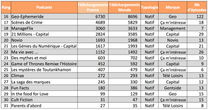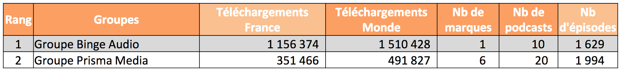 Le studio Binge Audio domine très largement ce premier classement en enregistrant plus d'un million de téléchargements avec 10 podcasts certifiés et 1 629 épisodes. Deux autres éditeurs apparaissent dans ce classement mensuel: Prisma Media et Warner.
