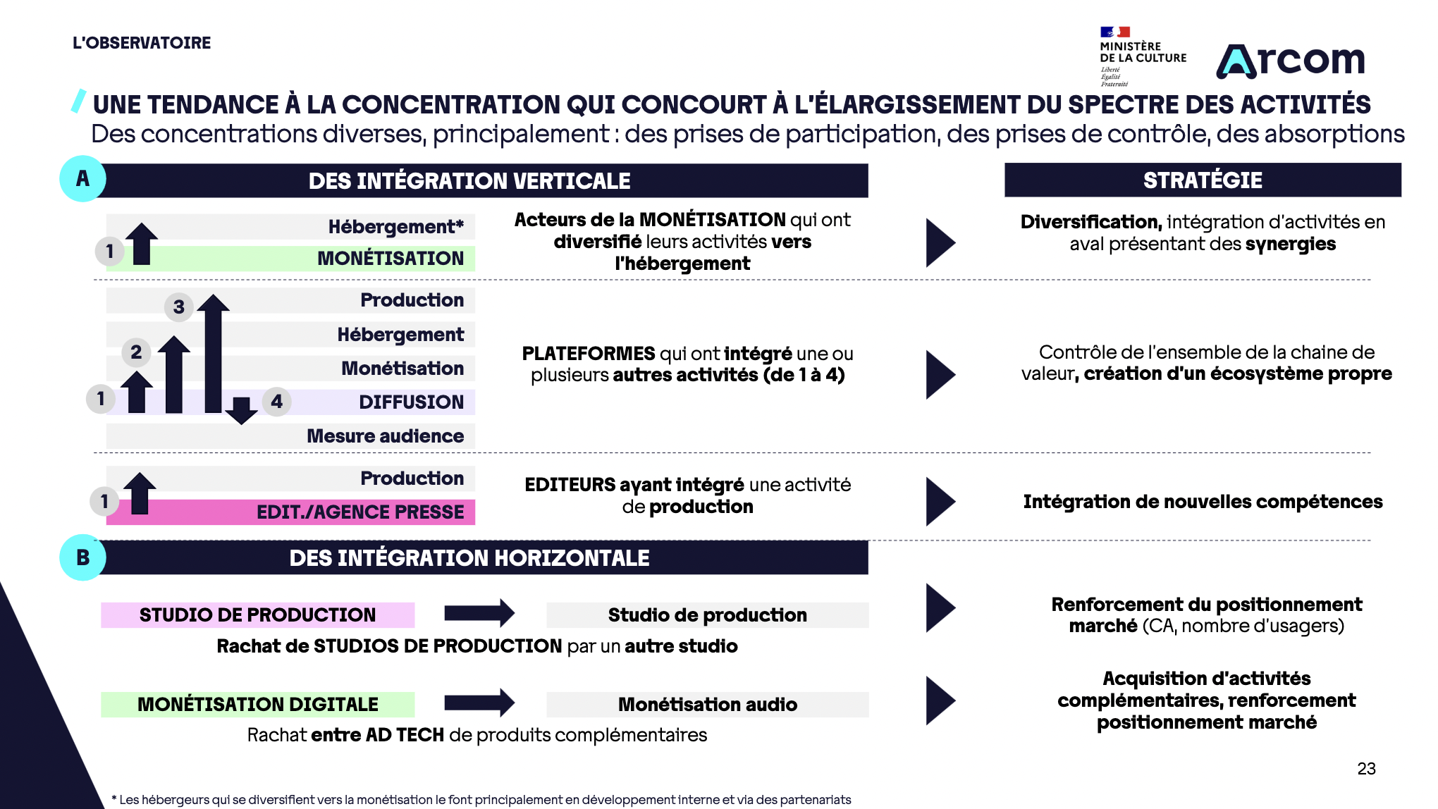 Cette étude relève des usages en forte croissance, un marché composé d’un large tissu d’entreprises, qui offre une création sonore abondante et créative, une multiplication des acteurs qui investissent dans les podcasts, associée à une croissance très dynamique du marché publicitaire et la structuration progressive du secteur avec un nombre significatif d’opérations de concentration et de diversification