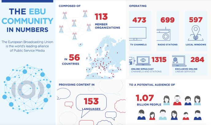 L'Union européenne de radio-télévision (UER) fédère 113 organisations membres dans 56 pays et revendique 31 associés supplémentaires en Asie, en Afrique, en Australasie et dans les Amériques. Les membres exploitent près de 2 000 chaînes et services de télévision, de radio et en ligne, et offrent une multitude de contenus sur d'autres plateformes. Ensemble, ils atteignent une audience de plus d'un milliard de personnes à travers le monde, diffusant dans plus de 160 langues.