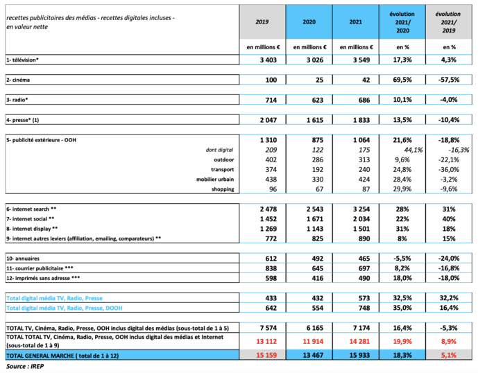 Sur le périmètre des 5 médias (TV, cinéma, radio, presse, publicité extérieure - incluant les recettes digitales des médias), les recettes publicitaires nettes totales s’élèvent à 7.174 milliards d’euros, en hausse de 16.4% par rapport à 2020. Les recettes nettes digitales cumulées de la télévision, de la presse, de la radio et du DOOH s’élèvent à 748 millions avec une croissance soutenue de 35% par rapport à 2020, confirmant l’accélération constatée tout au long de l’année 2021. Le marché publicitaire 2021 compte 64 882 annonceurs sur l’ensemble des médias (hors long tail), soit une augmentation de 2% versus 2020 et 4% versus 2019. La distribution est toujours le premier secteur publicitaire avec 5 acteurs dans le Top 10, parmi lesquels Lidl qui devient le premier annonceur de l’année, et prend la place de E.Leclerc, leader du marché depuis 2 ans.