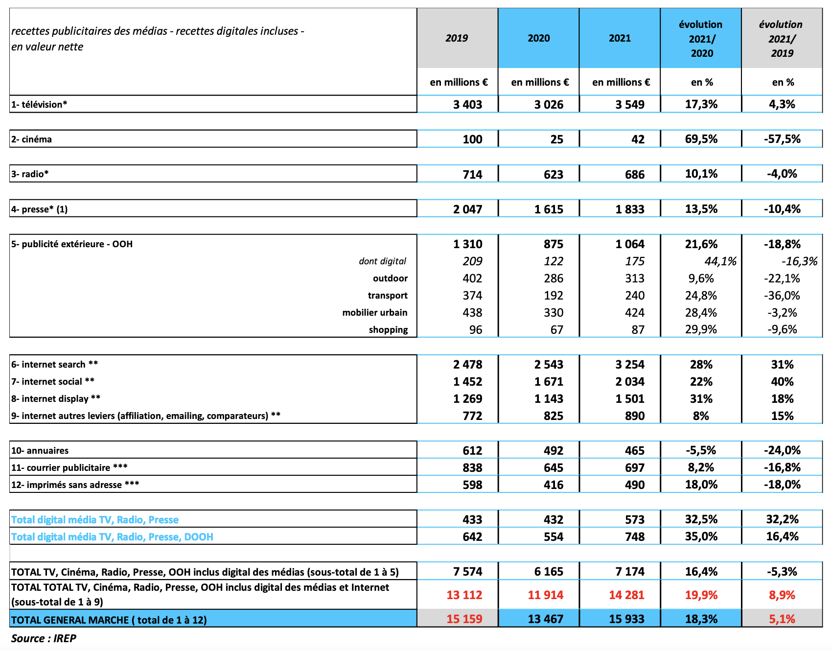 La télévision affiche d’excellentes performances avec une progression de +17.3% vs 2020. La presse dans son ensemble affiche une hausse de 13.5% vs 2020. La radio est également en forte croissance, à +10.1% versus 2020, et à -4% vesrus 2019.