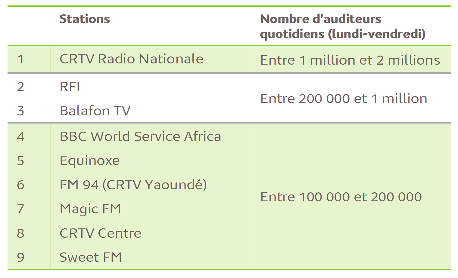 Soulignons également qu'entre le 12 mars et le 22 mai 2017, 83,5% des habitants de Yaoundé, Douala, Bafoussam et Bamenda ont regardé chaque jour la télévision, soit 3,1 millions de personnes. Ils y ont consacré en moyenne 4 heures et 43 minutes quotidiennement...