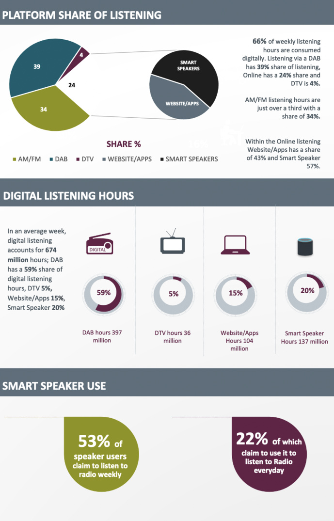 Sur une semaine moyenne, l'écoute numérique représente 674 millions d'heures. Le DAB obtient une part de 59% des heures d'écoute (15% via le web et les applications et 20% sur les enceintes connectées).