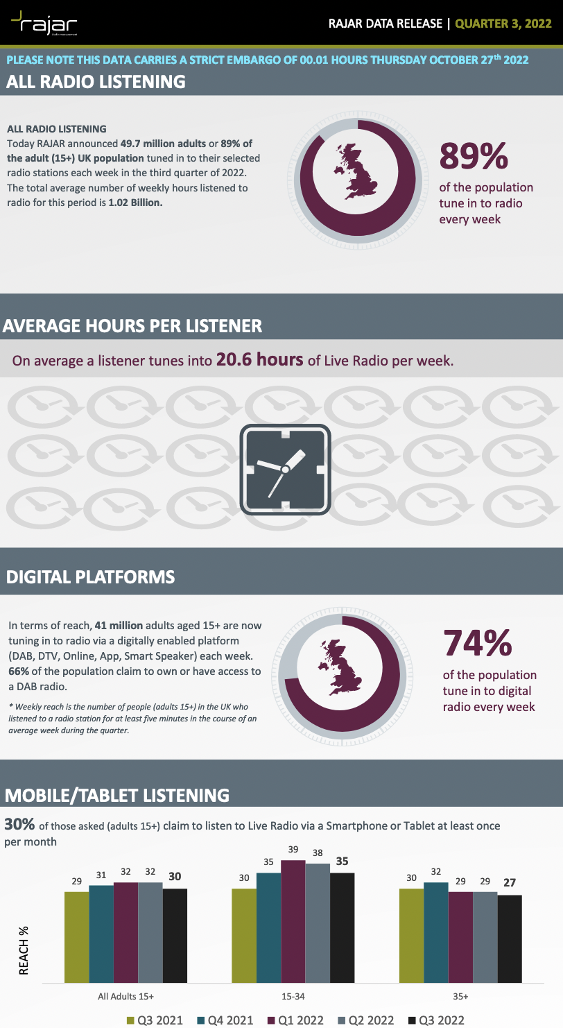 En moyenne, un auditeur britannique écoute 20.6 heures de radio en direct par semaine. En termes de portée, 41 millions d'adultes âgés de 15 ans et plus écoutent désormais la radio via une plateforme numérique (DAB, DTV, Online, App, enceinte connectée). 74% de la population écoute la radio numérique chaque semaine. Chaque semaine. 66% de la population déclare posséder ou avoir accès à une radio DAB. Soulignons que 30% des personnes interrogées déclarent avoir écouté la radio en direct via un smartphone ou via une tablette au moins une fois par mois.