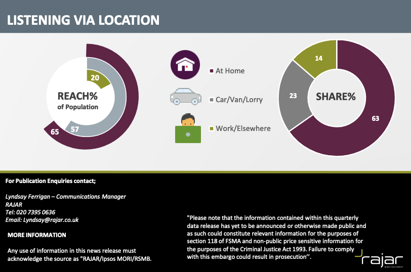 Les britanniques ont principalement écouté la radio au domicile (63%), en voiture (23%) et au travail (14%).