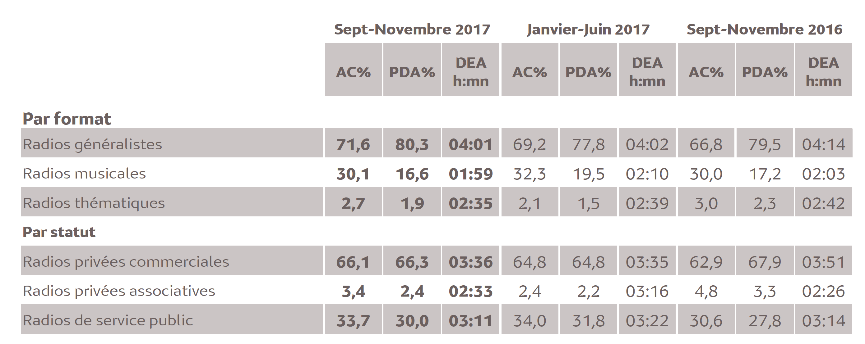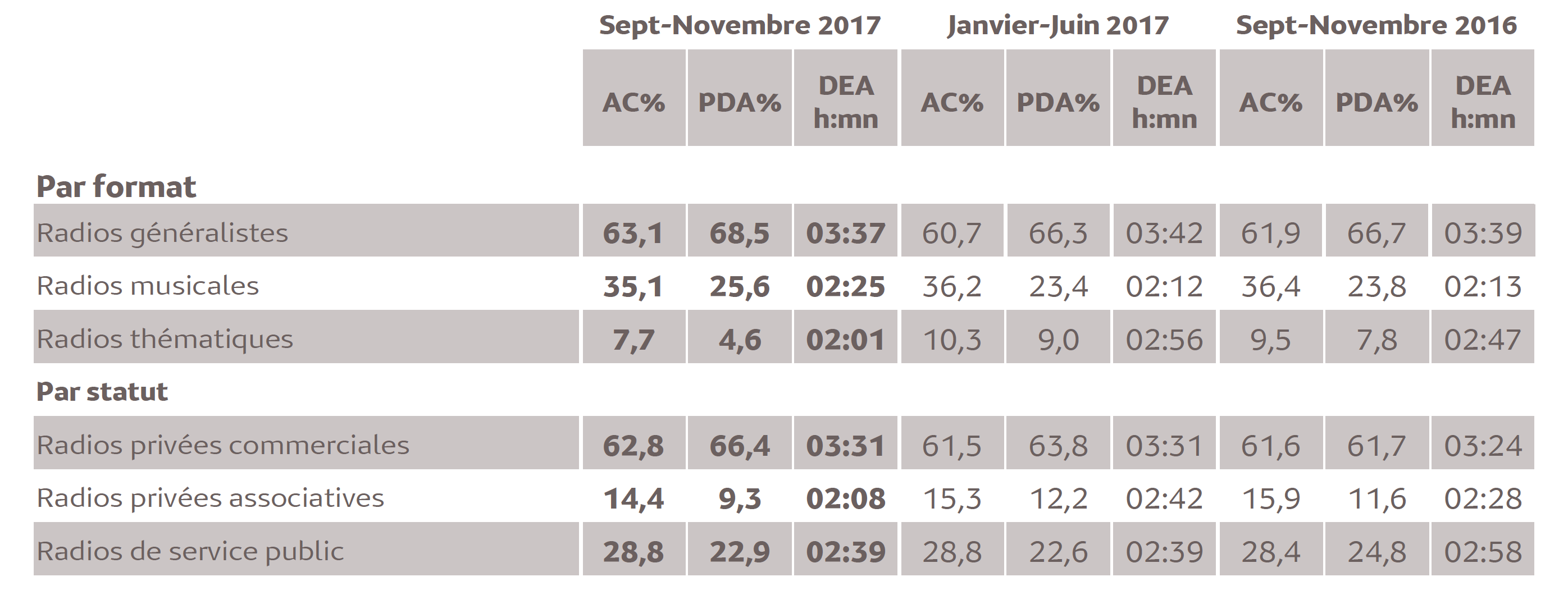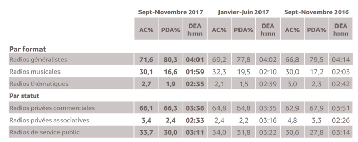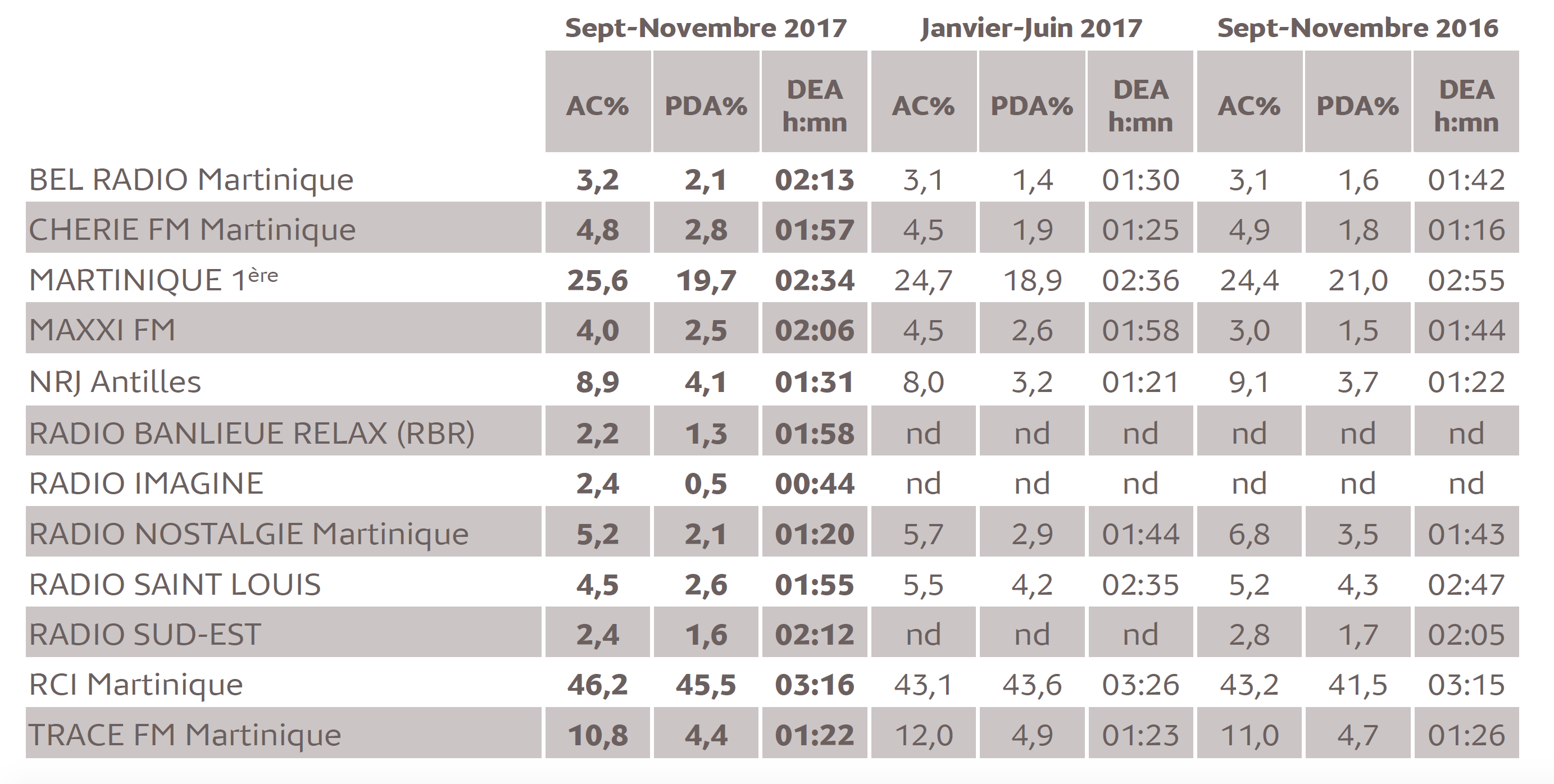 Quasiment le même constat pour la Martinique où les radios généralistes génèrent plus de 63% de l'audience cumulée. Encore une fois, RCI domine ses concurrentes avec 46.2% d'audience cumulée, 45.5% de part d'audience pour une DEA de 3h16. Des résultats à faire pâlir les radios de la métropole...