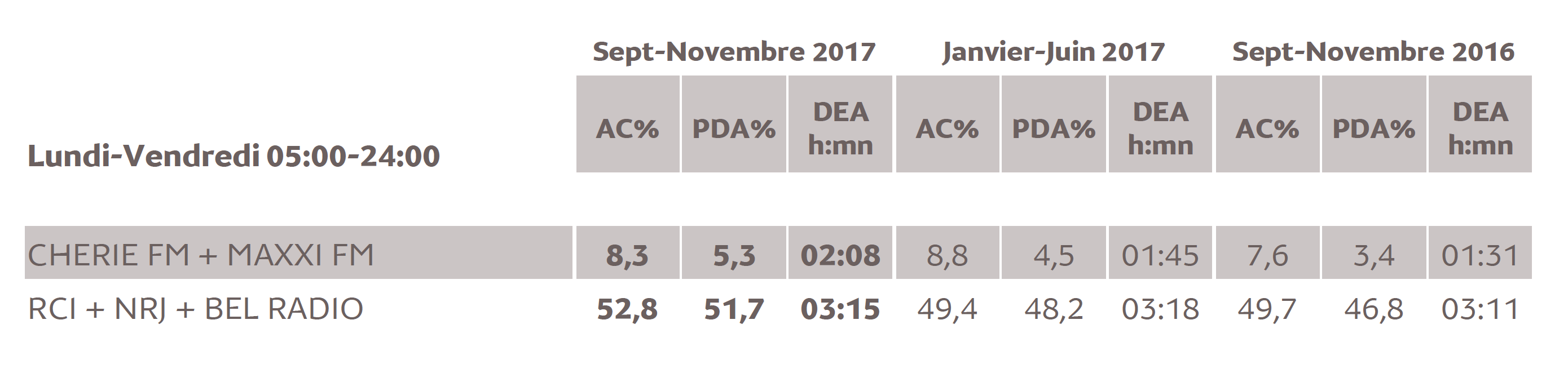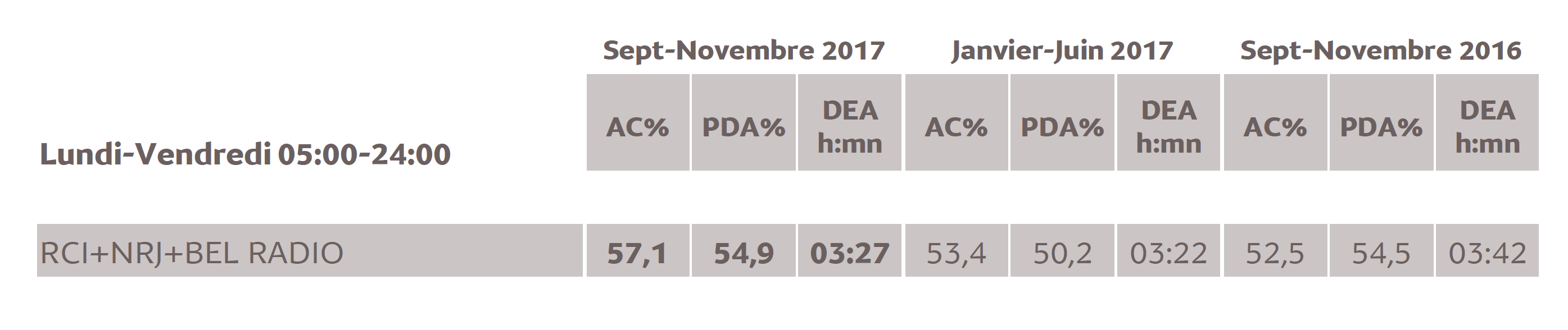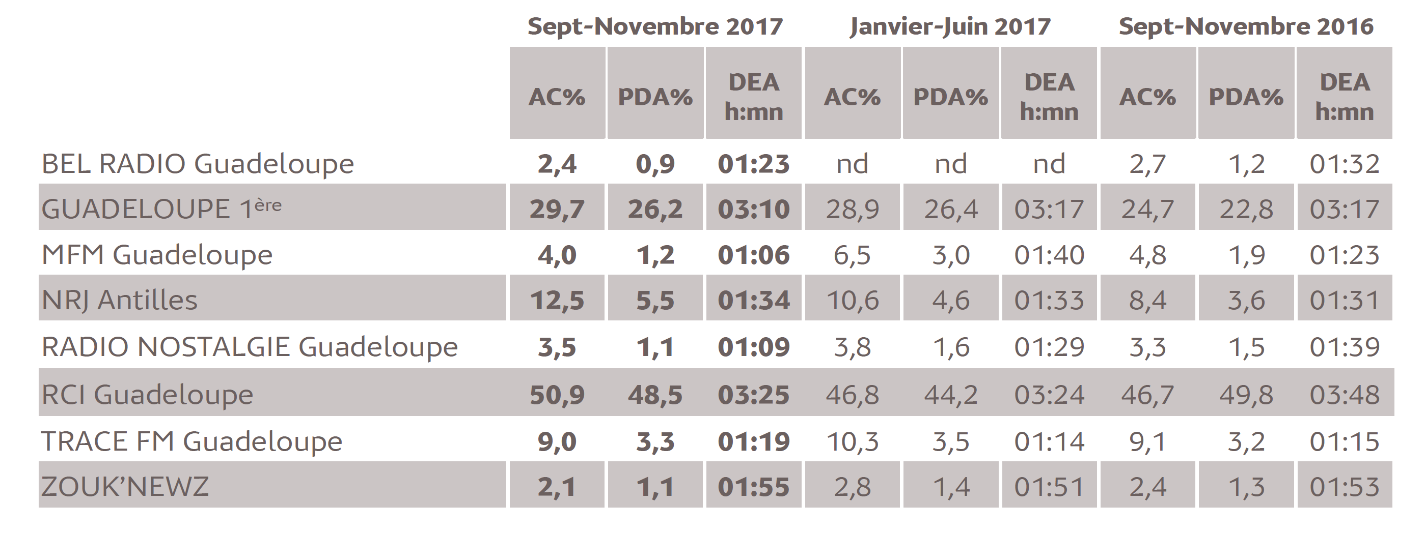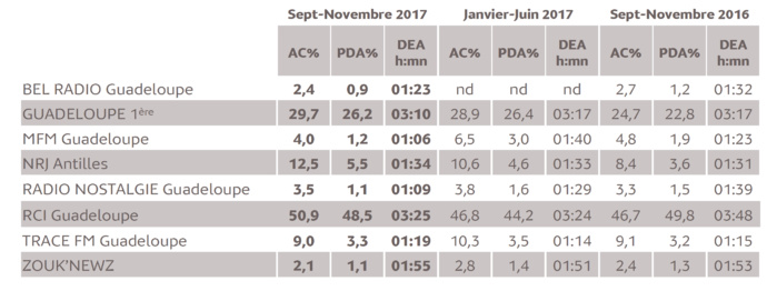 Première constatation, la puissance des radios généralistes qui réalisent à elles seules plus de 71% de l'audience cumulée contre 30.1 pour les radios musicales. En Guadeloupe, on écoute RCI qui pèse plus de la moitié de l'audience cumulée (50.9). Seule Guadeloupe 1ère et, dans une moindre mesure, NRJ Guadeloupe semble résister à son emprise sur les auditeurs. C'est aussi RCI qui réalise la plus forte part d'audience avec 48.5% pour 3h25 de DEA.