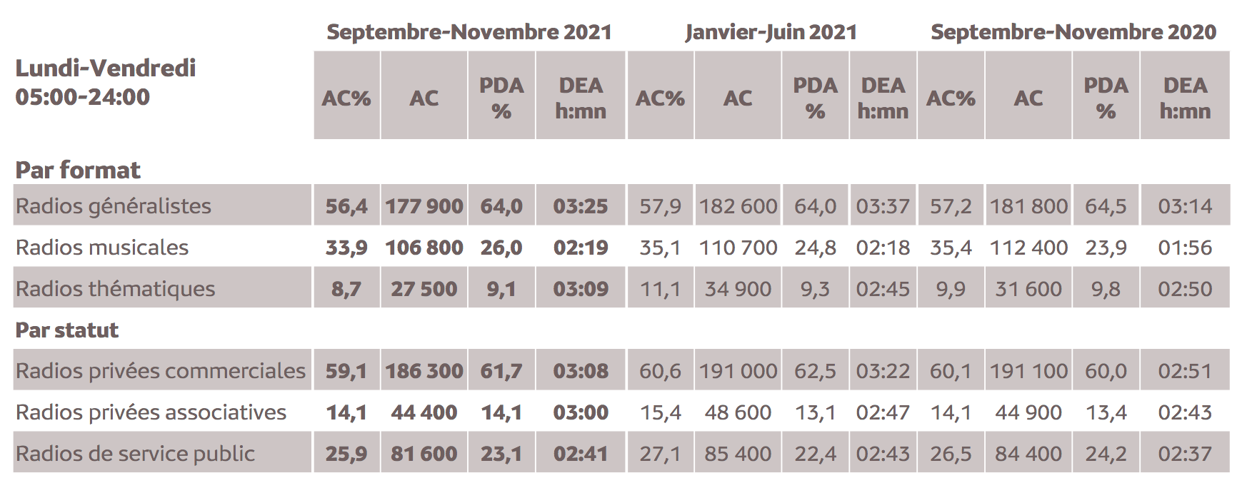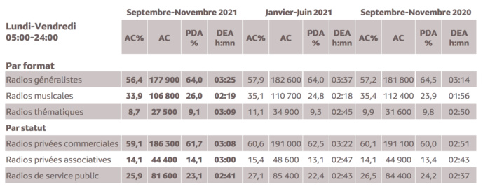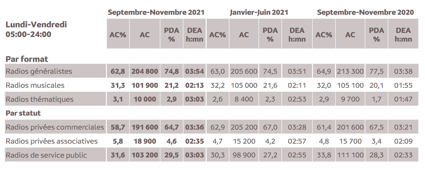 Rappelons d'abord que seuls sont publiés les résultats des supports qui ont souscrit à l’étude au jour de parution, et dont l’audience cumulée pour un jour moyen de semaine atteint 2 % pour la radio (du lundi au vendredi et de 05h à minuit).