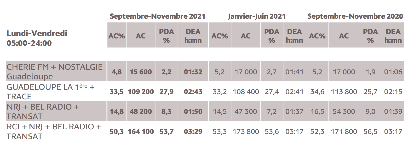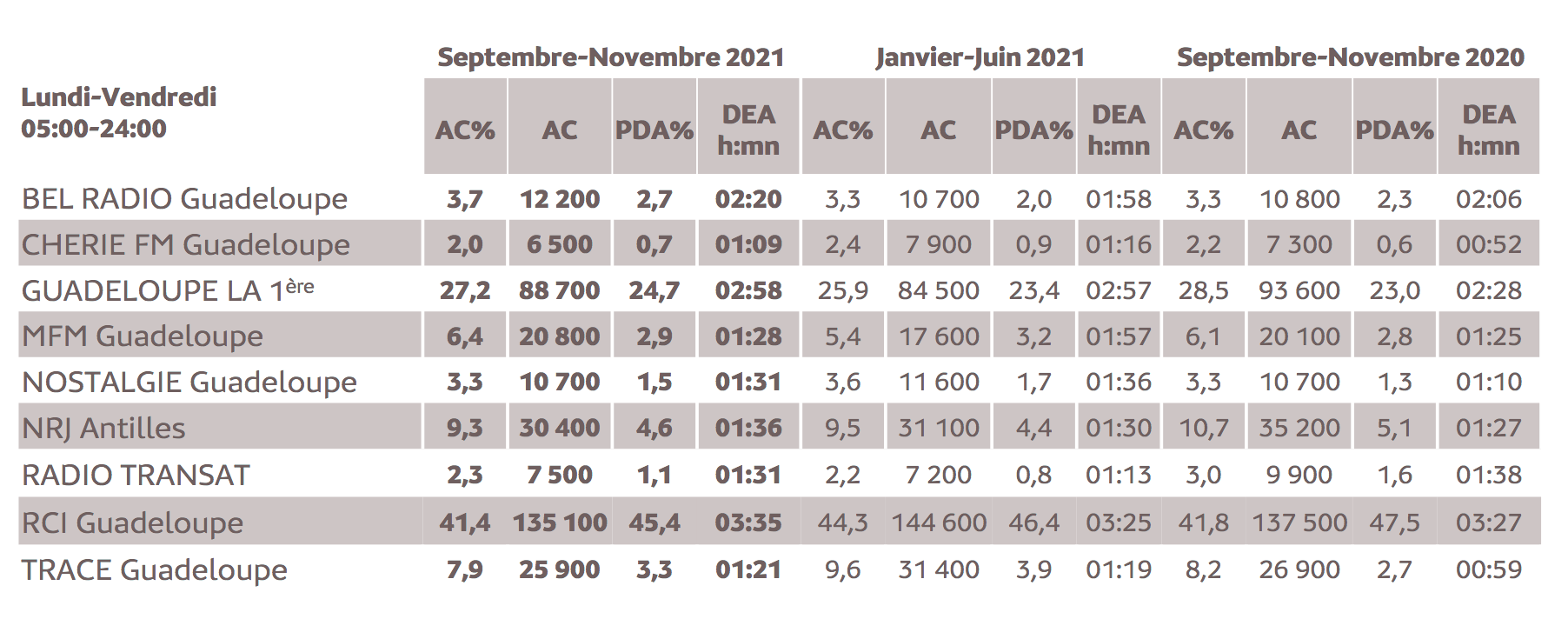 En Guadeloupe, 1% d'audience cumulée représente 3 154 auditeurs de 13 ans et plus. Là encore, le classement est identique avec RCI Martinique qui atteint 40.8% d'audience cumulée pour 40.7 de PDA et une DEA à 03h00. Suit Martinique La 1ère avec respectivement 21.9%, 19.0% et 2h36.