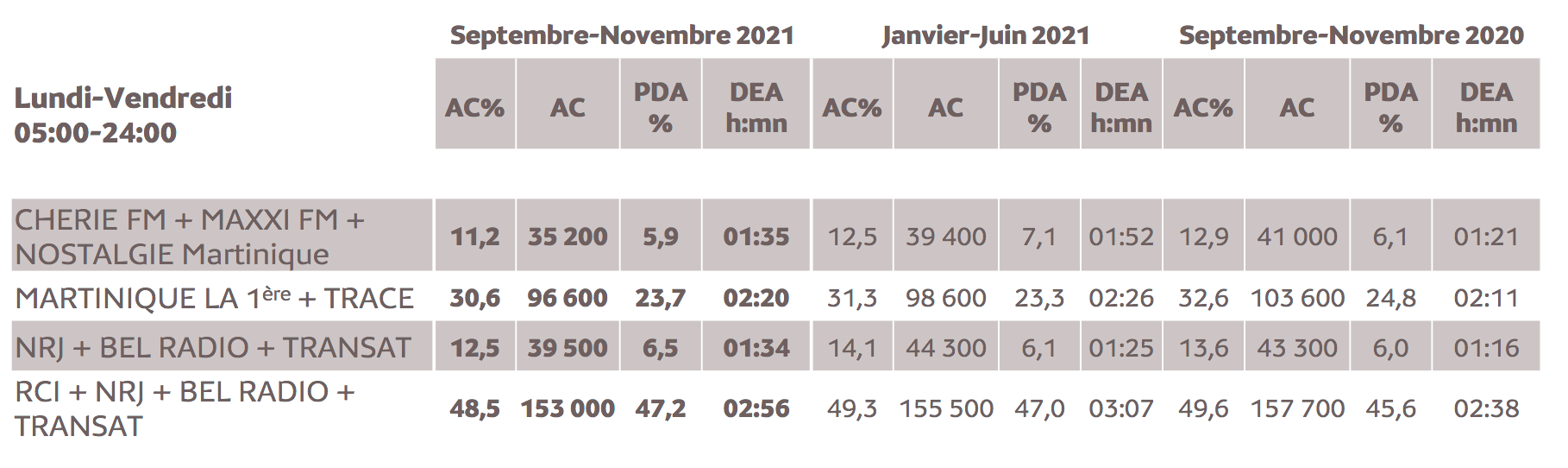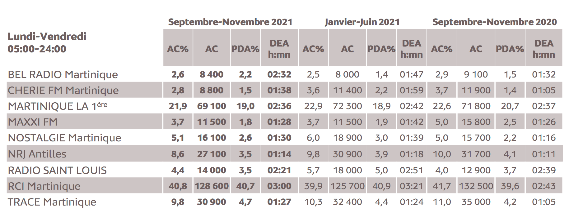 En Guadeloupe, la radio enregistre une audience cumulée de 77.1% sur cette vague (contre 78.7% sur la même période, il y a un an). En Martinique, la radio génère 76.0% d'audience cumulée (contre 77.1% sur la même période, il y a un an). Pour autant, la DEA globale est en nette hausse : 4h14 en Guadeloupe (versus 3h52 il y a un an) et 3h57 en Martinique (versus 3h43 il y a un an).