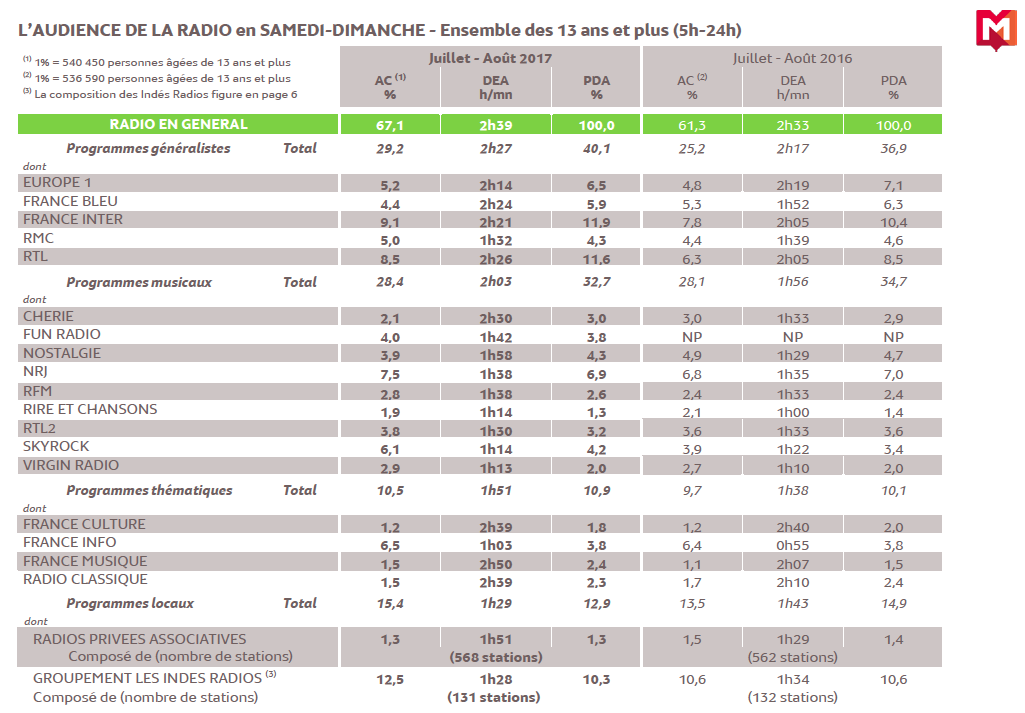 Source : Médiamétrie - Grilles Radio d’Eté - Juillet-Août 2017 - Copyright Médiamétrie - Tous droits réservés