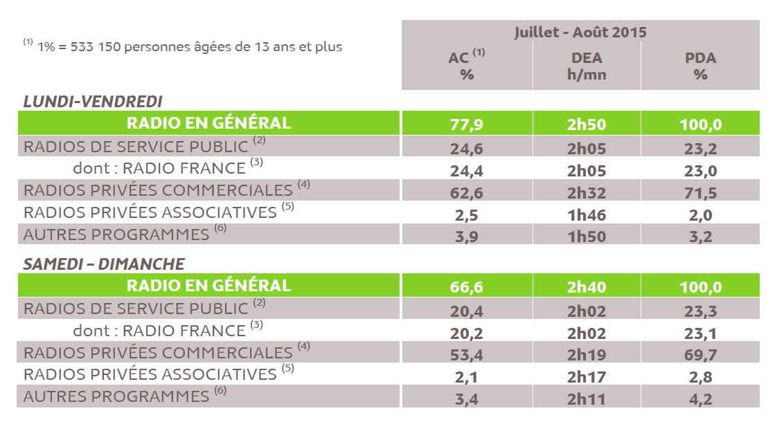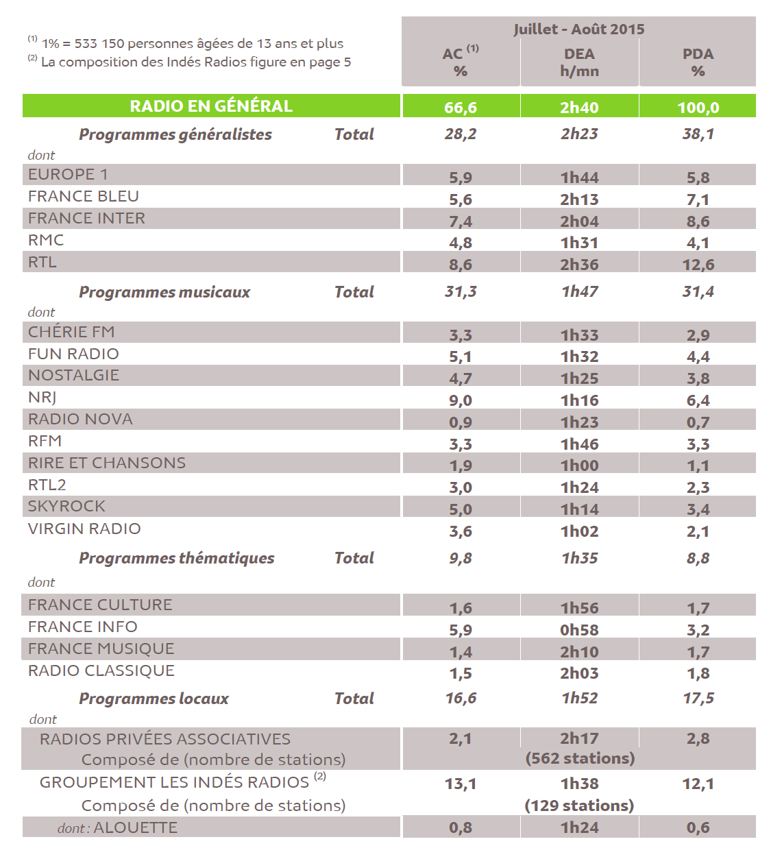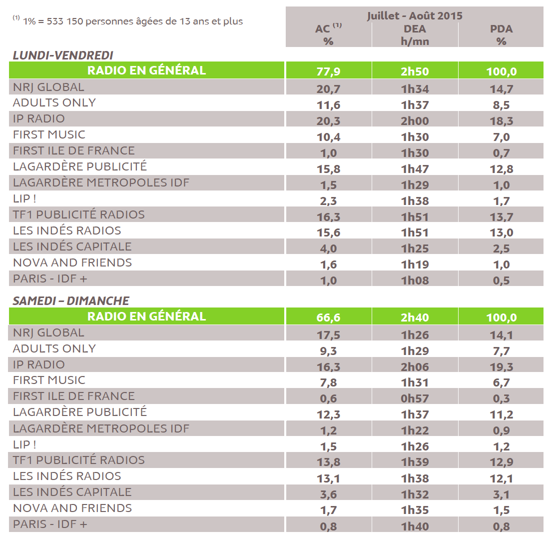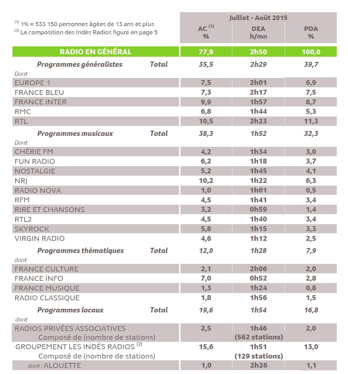 Comme d'habitude, seuls sont mentionnés les stations, réseaux et couplages souscripteurs à l’enquête qui atteignent au moins 1% d’audience cumulée en lundi au vendredi (5h-24h).