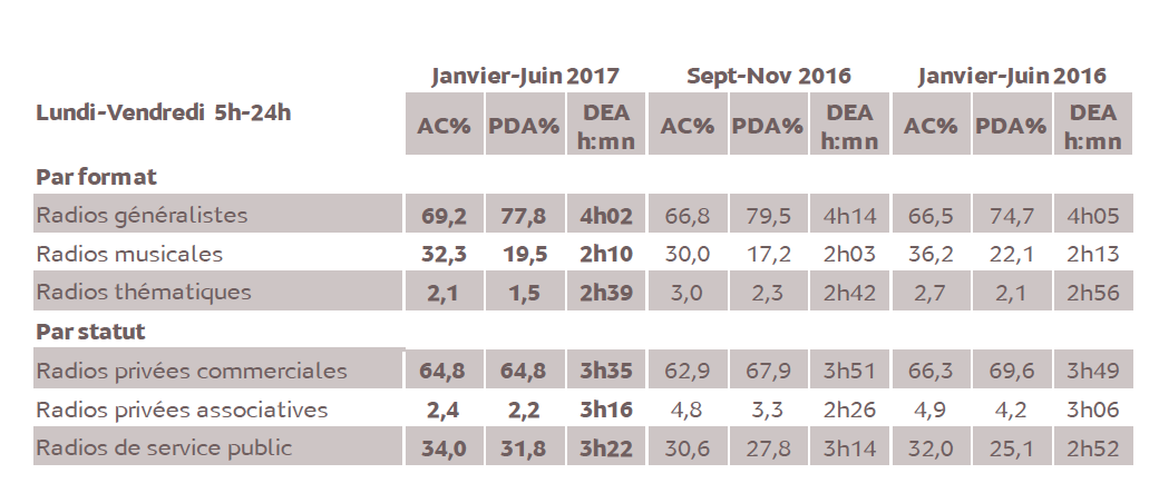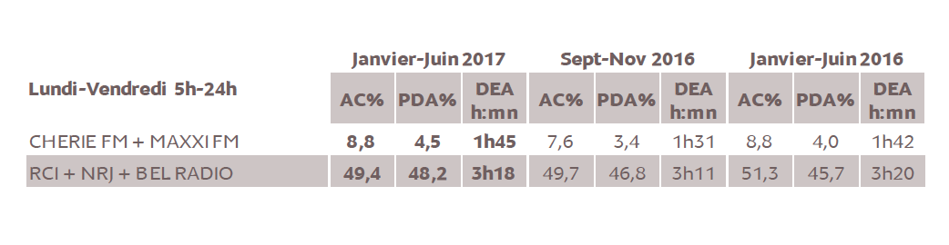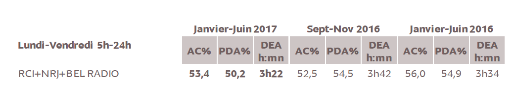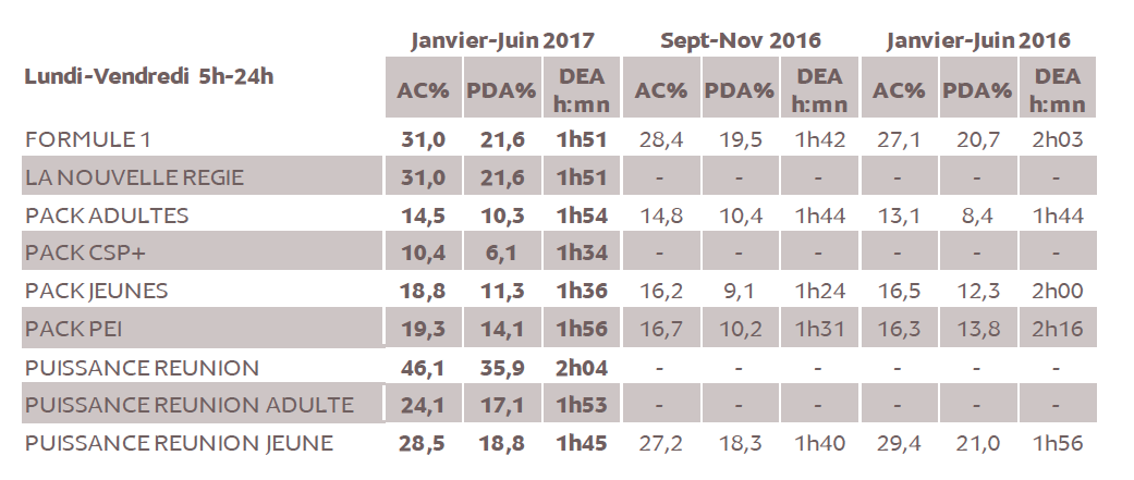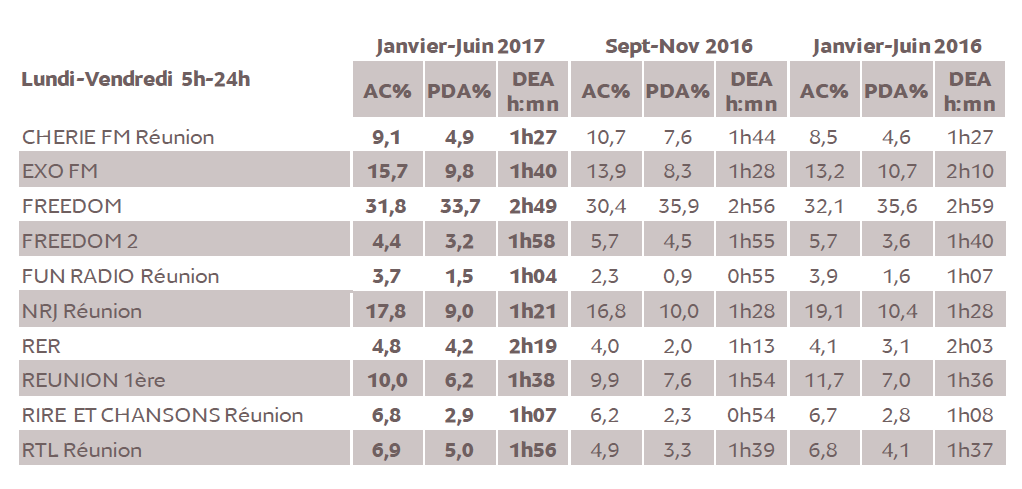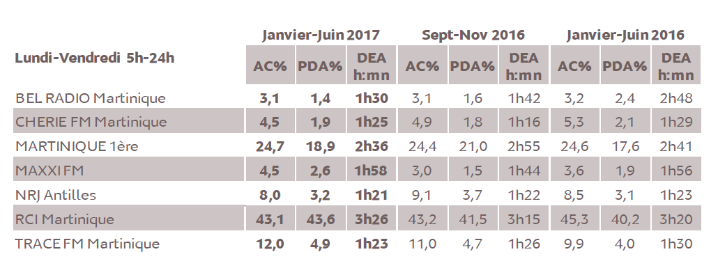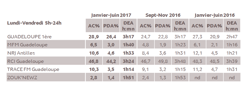En Guadeloupe, 1% d’audience cumulée en 2017 représente 3 336 personnes âgées de 13 ans et plus. En Martinique, 1% d’audience cumulée en 2017 représente 3 248 personnes âgées de 13 ans et plus. À La Réunion, 1% d’audience cumulée en 2017 représente 6 927 auditeurs de 13 ans et plus.