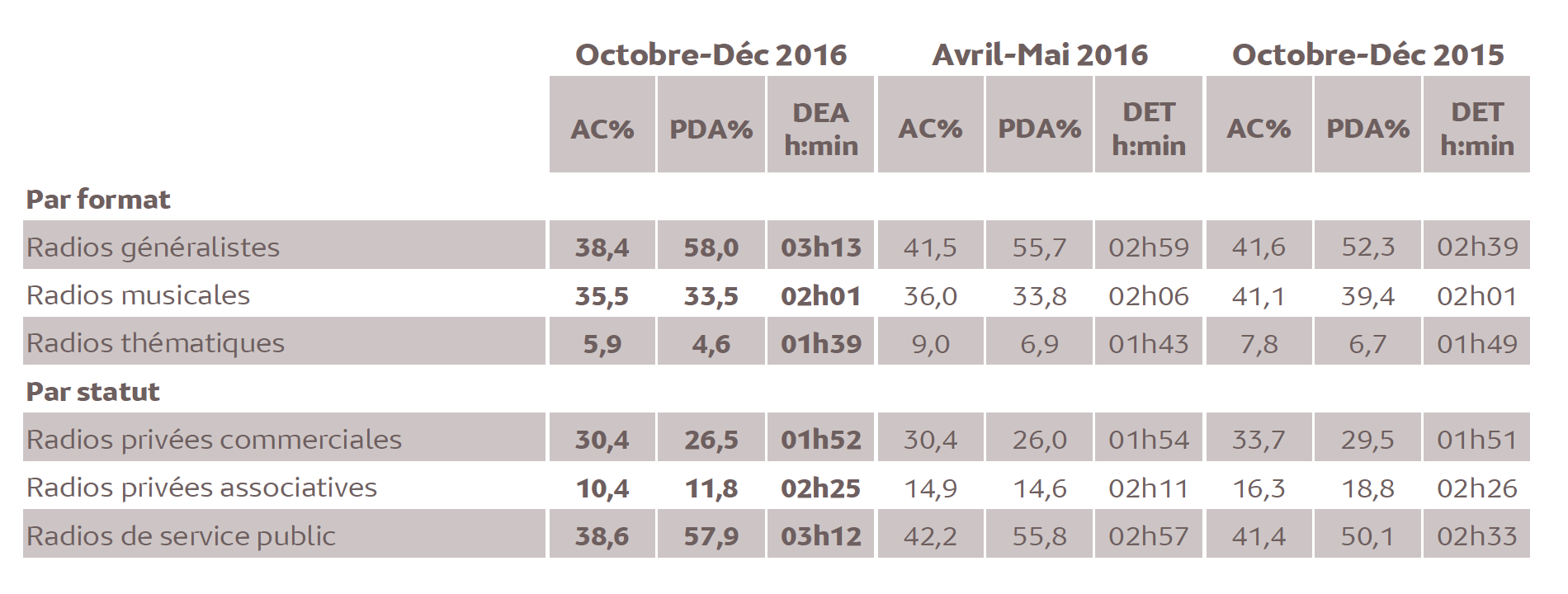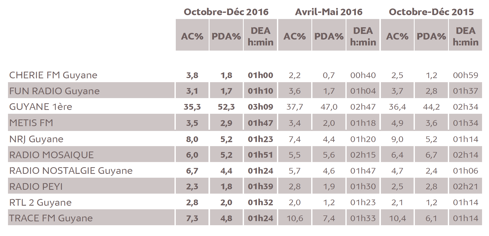 En Guyane, c'est Guyane 1ère qui domine le marché de la radio : 35.3% d'audience cumulée pour 52.3 de PDA et une durée d'écoute de 3h09. Autant dire que la station du service public laisse très loin derrière ses concurrentes. Toutes les radios se classent en-dessous des 10 points d'audience cumulée. Dans la suite du Top 5, NRJ Guyane (8%), Trace FM (7.3), Radio Nostalgie Guyane (6.7) et Radio Mosaïque (6%). Suivent Chérie FM Guyane (3.8), Métis FM (3.5), Fun Radio Guyane (3.1), RTL2 Guyane (2.8) et Radio Peyi (2.3).