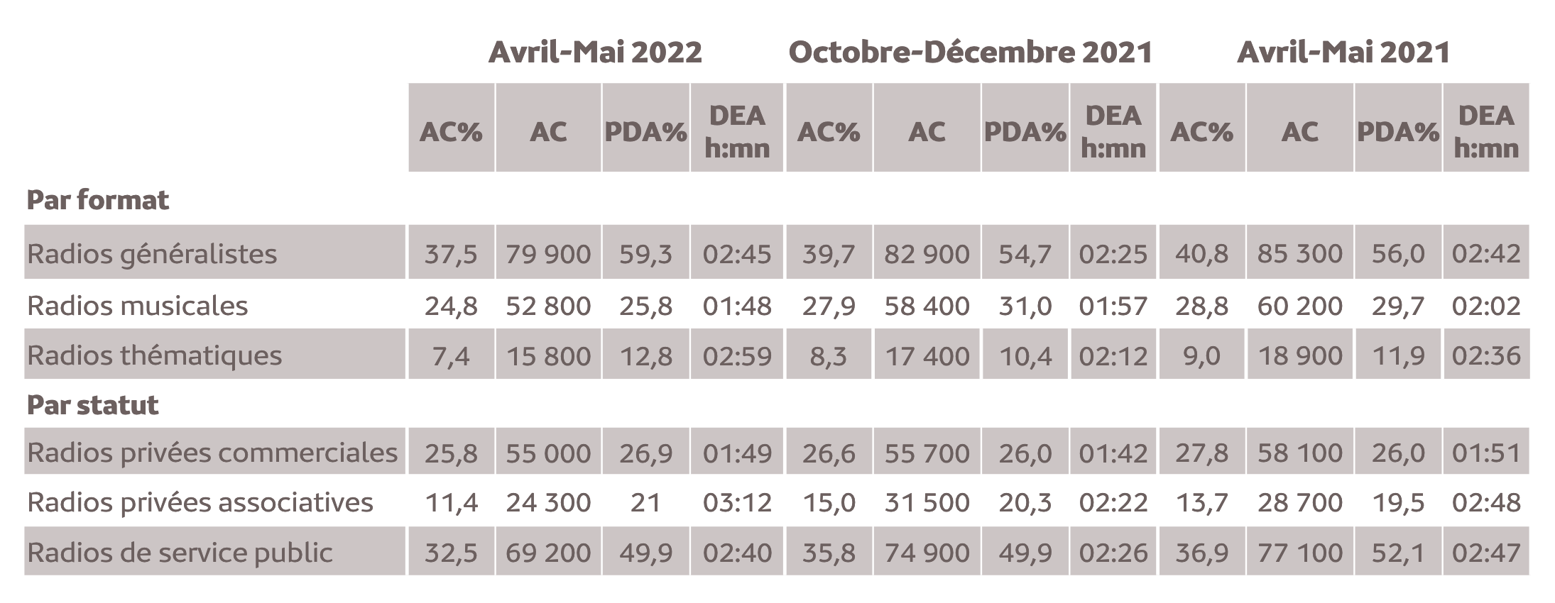 Tous les supports sont mesurés dans le cadre de l’étude Métridom mais seuls sont publiés les résultats des supports dont l’audience cumulée pour un jour moyen de semaine atteint 2%, du lundi au vendredi. En Guyane, 1% d’audience cumulée en avril-mai 2022 représente 2 130 personnes âgées de 13 ans et plus. Deux stations apparaissent dans les résultats : Guyane La 1ère avec 29.6% (63 100 auditeurs) et Trace FM avec 5.5% d'audience cumulée (11 800 auditeurs) pour 4.1% de PDA et 1h18 de DEA.