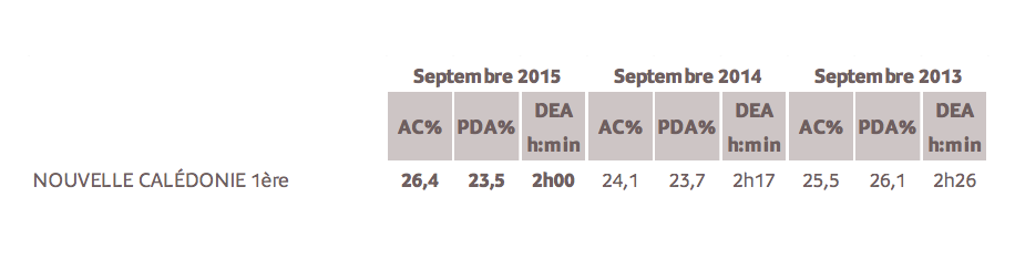 Pour autant, la station Nouvelle Calédonie 1ère génère une audience cumulée de 26.4 (en hausse sur un an) pour 23.5 de PDA. Elle enregistre également une DEA de 2h00 (en baisse continue depuis 2013).