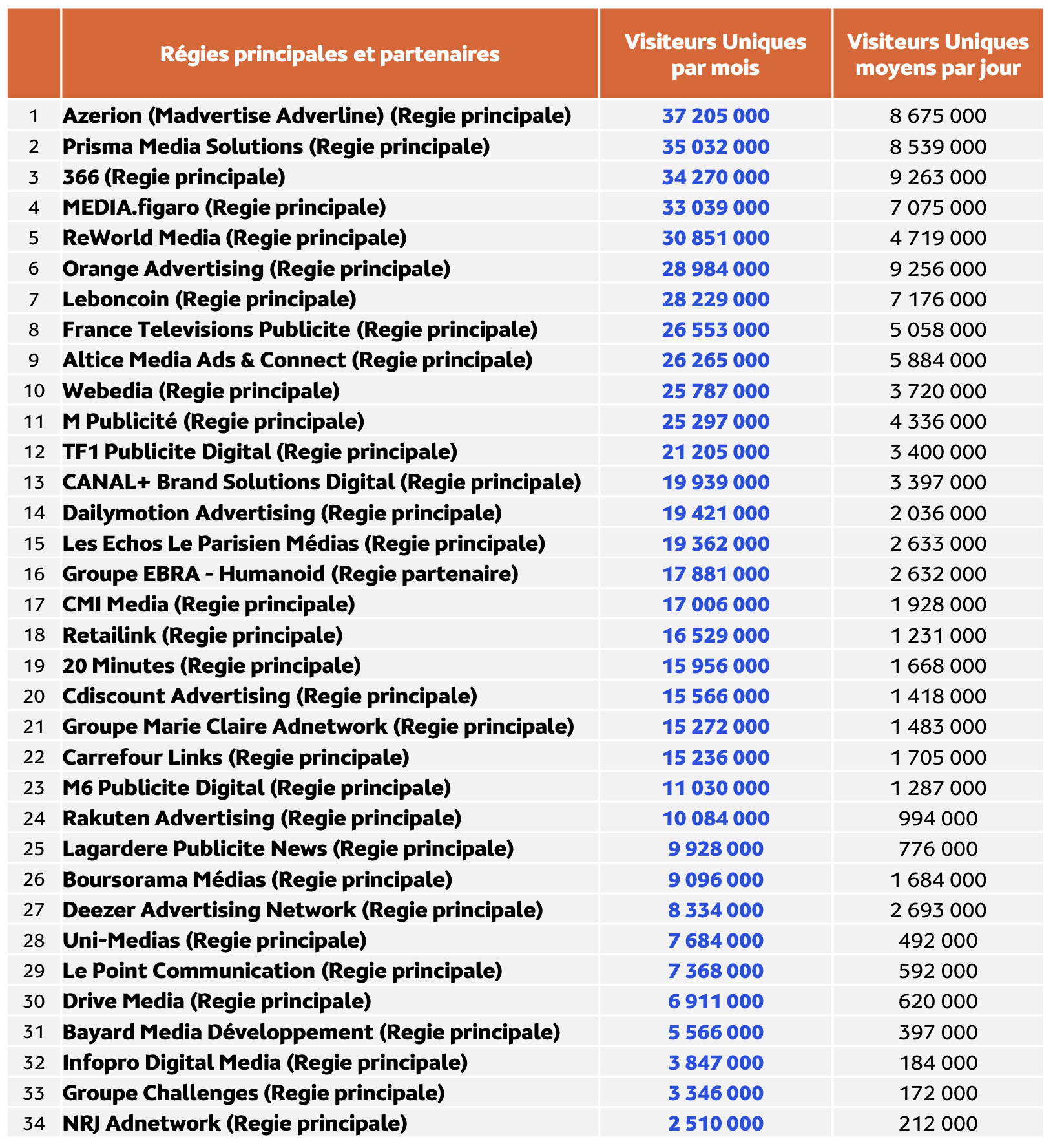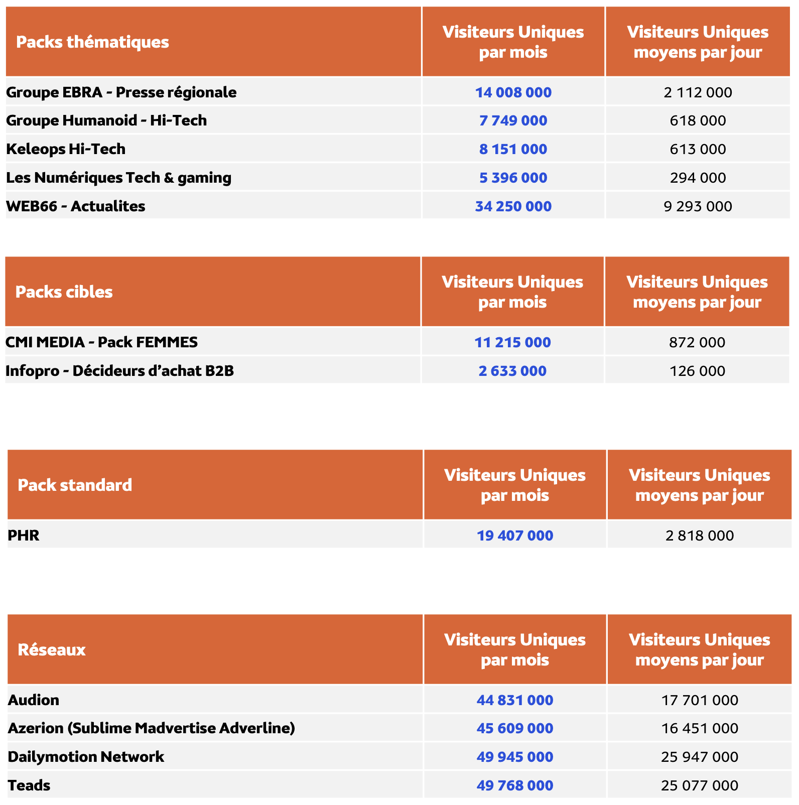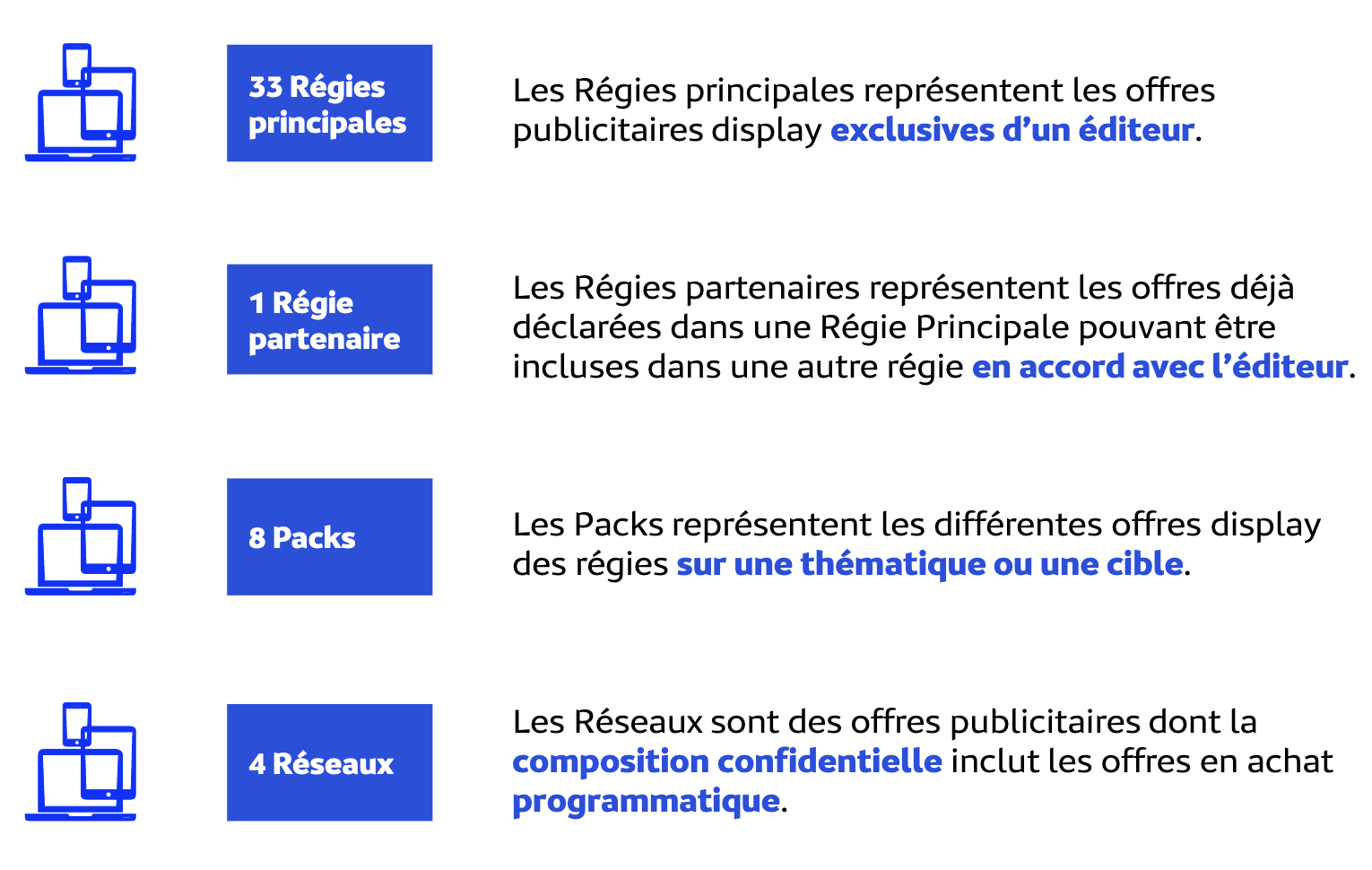 Ces résultats publicitaires, non exhaustifs, permettent de valoriser l’audience de regroupements de sites et applications commercialisés par les régies et les éditeurs et sont disponibles pour les agences dans les outils de mediaplanning. À partir des données mesurées en avril 2024 sur les acteurs souscripteurs, Médiamétrie a publié l’audience, l’affinité et les usages de 46 offres publicitaires à travers 70 cibles socio-démographiques de référence : 33 régies principales qui représentent les offres publicitaires display exclusives d’un éditeur, une Régie Principale pouvant être incluses dans une autre régie en accord avec l’éditeur, huit packs représentent les différentes offres display des régies sur une thématique ou une cible et quatre réseaux sont des offres publicitaires dont la composition confidentielle inclut les offres en achat programmatique.