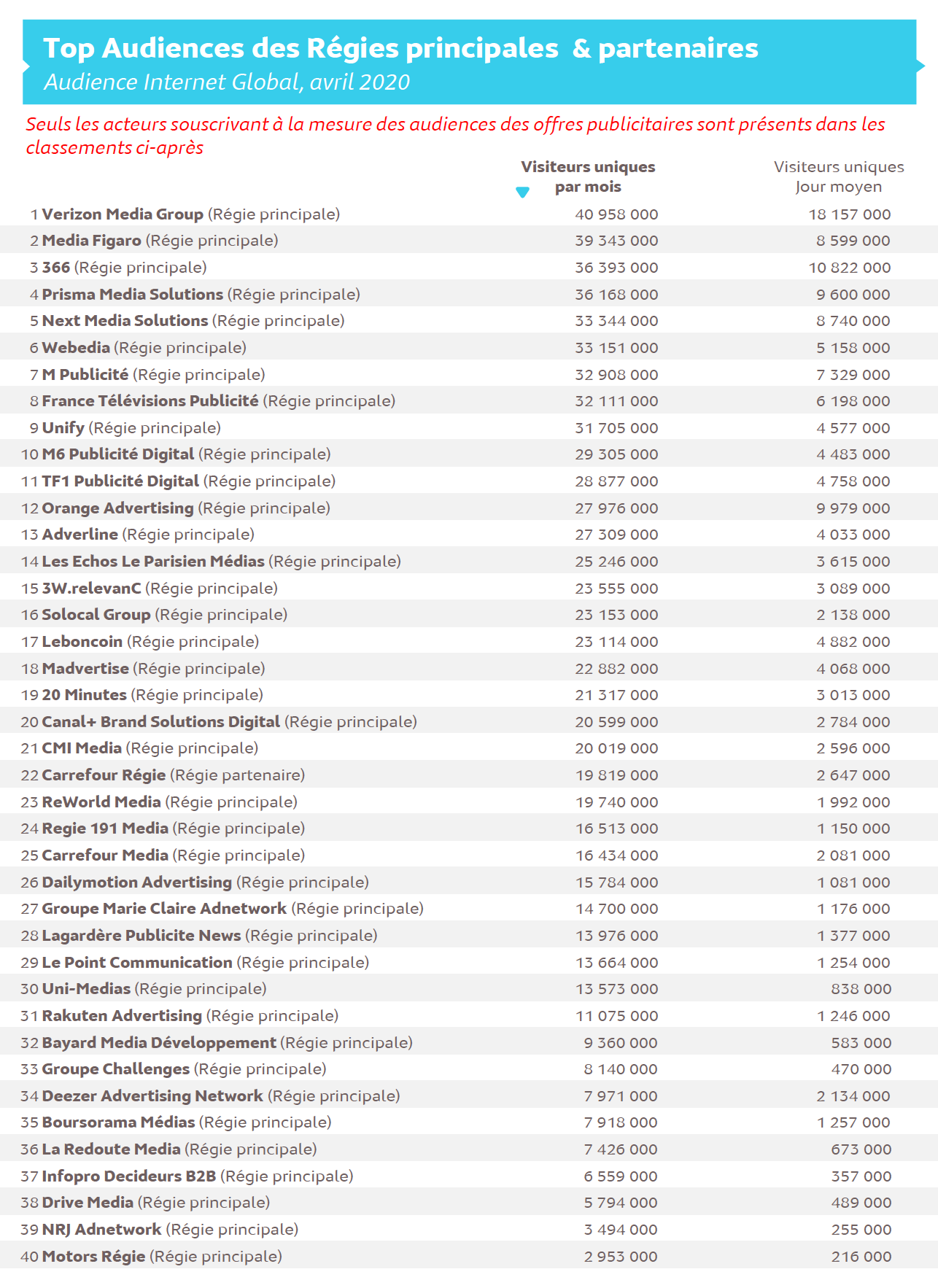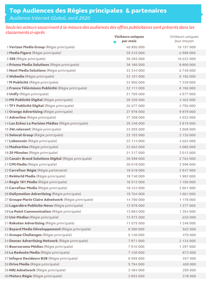 Source : Médiamétrie et Mediametrie NetRatings Audience Internet Global France Avril 2020 Copyright Mediametrie NetRatings Tous droits réservés