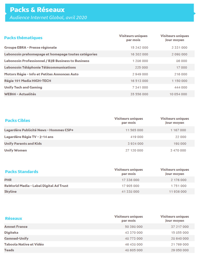 À partir des données mesurées en avril 2020 sur les acteurs souscripteurs, Médiamétrie a publié l’audience, l’affinité et les usages de 63 offres publicitaires à travers 68 cibles socio démographiques de référence.